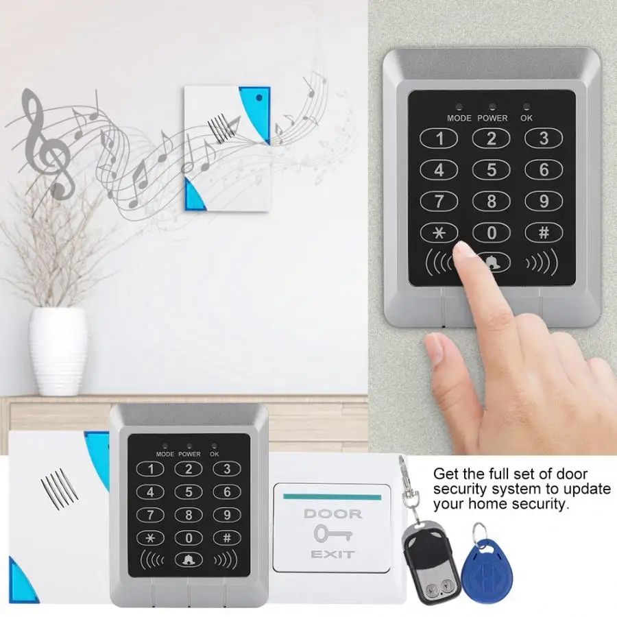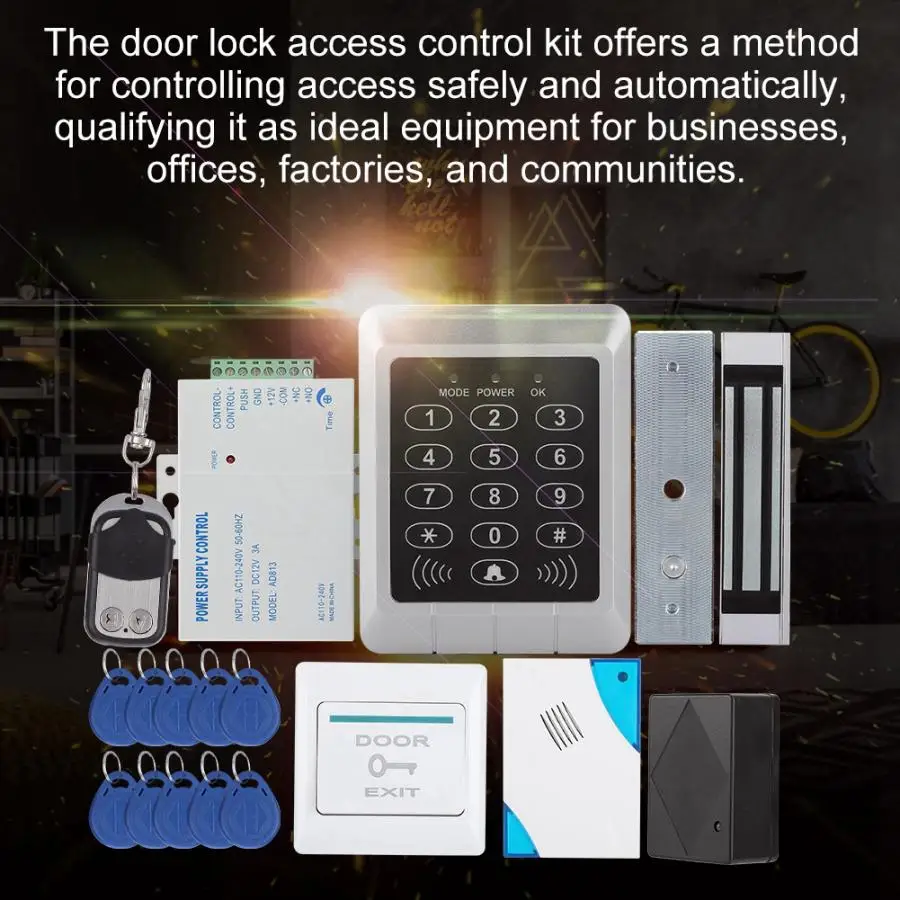 Комплект контроля доступа к дверным замкам предлагает метод безопасного и автоматического контроля доступа, квалифицируя его как идеальное оборудование для бизнеса, офисов, заводов и кругов. Получите полный комплект системы безопасности двери для обновления вашей домашней безопасности. Он мощный и может открыть дверь с помощью бесконтактных карт, паролей или гибрида. Пульт дистанционного управления: он разделен на приемник и передатчик. Приемник подключен к источник питания с контролем доступа, а Передатчик используется для дистанционного разблокирования. Используйте современные и методы интегральной схемы, чтобы сохранить все данные от потери из-за отключения питания. Контроллер доступа может предоставить пользователям больше удобства, подключив к терминалам. Кнопка открытия дверей: Подключите дополнительные кнопки разблокировки, чтобы предоставить больше способов разблокировки Dingdong дверной Звонок: дверной звонок соединен с самолетом контроля доступа, чтобы облегчить посещение, чтобы позвонить хосту