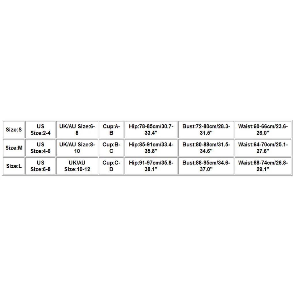 Размер Американский размер Размер Великобритании/Австралии Чашка Бедра Бюст Талия S 2-4 6-8 A-B 78-85 см/30,7-33,4" 72-80 см/28,3-31,5" 60-66 см/23,6-26,0" М 4-6 8-10 B-C 85-91 см/33,4-35,8" 80-88 см/31,5-34,6" 64-70 см/25,1-27,6" L 6-8 10-12 C-D 91-97 см/35,8-38,1" 88-95 см/34,6-37,0" 68-74 см/26,8-29,1"