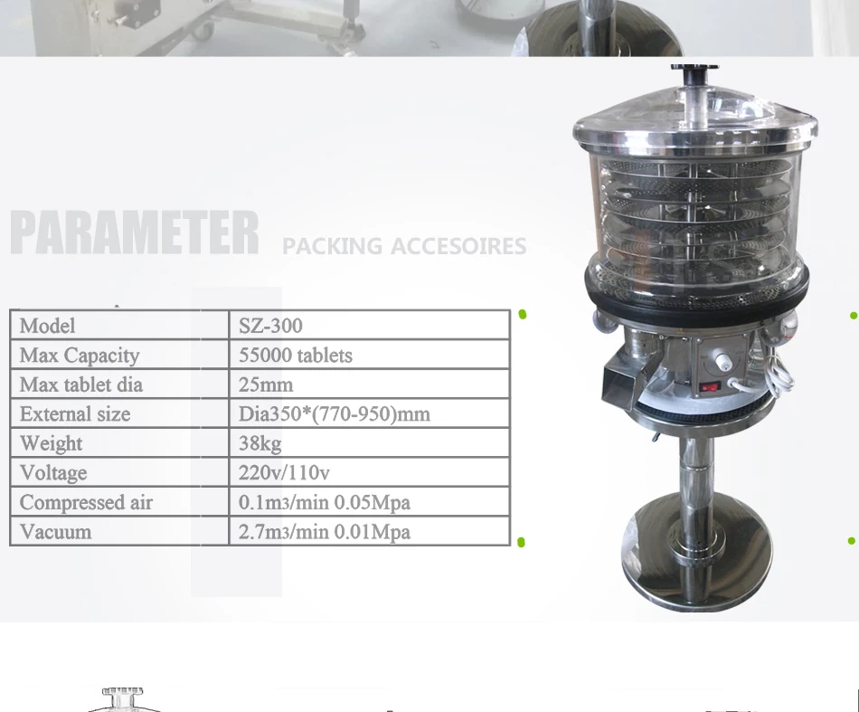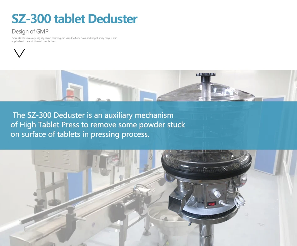 Обеспыливатель Введение: Машина является фармацевтическим оборудованием, которое удаляет мелкую поверхность пыли от таблеток с помощью вибрационного эффекта. Подходит для удаления пыли всех типов таблеток. Выпыление достигается в трех этапах процесса с пропускной способностью прибл. 550000 таблеток в час. Область применения: Наш LD-300 deduster таблетки является вспомогательным механизмом высокого таблеточного пресса, чтобы удалить некоторые порошок, застрявший на поверхности таблеток в процессе прессования. Это также оборудование для транспортировки таблеток, кусковых лекарств или гранул без пыли, и может быть подходит для соединения с поглотителем или воздуходувкой в качестве пылесоса, с его высокой эффективностью, лучший эффект от пыли, низкий уровень шума и простота обслуживания. Он широко используется в фармацевтической, химической и пищевой промышленности. Основные характеристики: 1. Дизайн GMP 2. Двухслойная структура экрана, отделяющая планшет и порошок 3. V-образная конструкция для порошкового диска, отполированная эффективно 4. Регулируемая скорость и амплитуда 5. Легко работать и поддерживать 6. Надёжная работа и низкий уровень шума Технические параметры: Модель SZ-300 Макс Ёмкость 55000 таблетки Макс. для планшетов диаметр 25 мм Внешний размер Dia350 *(770-950) мм Вес 38 кг Напряжение 220v/110v Сжатый воздух 0.1m 3/мин 0.05Mpa Вакуумный 2.7m 3/мин 0.01Mpa ♦Проектно Помочь вам выбрать оборудование, дизайн производственного процесса потока в соответствии с фактической производственной средой заказчика и производственными требованиями. ♦Установка обучение Обеспечить телефонное руководство для установки и отладки оборудования; Или отправить техника для установки и отладки машины и обучить ваших работников, если это необходимо. Обеспечить бесплатное соответствующее обучение по требованию клиента. Долгосрочная техническая поддержка. ♦Пост-продажное обслуживание Один год гарантии, пожизненное техническое обслуживание; 24 часа в сутки для технического консультационного обслуживания; После проблем с оборудованием, предоставьте телефон или план устранения неисправностей на месте. ♦Один годовая гарантия времени С даты, когда продукт является квалифицированным вводом в эксплуатацию. Любые повреждения, за исключением неправильной работы в течение гарантийного срока, отремонтированы свободно. Но расходы на поездки и проживание должны быть оплачены покупателем. ♦Зарубежного сервиса Инженеры доступны для обслуживания машинного оборудования за рубежом. ♦Несем ответственность за 24 часа в сутки Мы ценим каждый запрос, отправленный нам, гарантируем быстрое конкурентное предложение в течение 24 часов. ♦Полный документ Все необходимые документы будут предоставлены. ♦Способ оплаты Мы принимаем различные условия оплаты, такие как аккредитив, T/T, western Union, Money Gram, AlibabaTade Asurance.