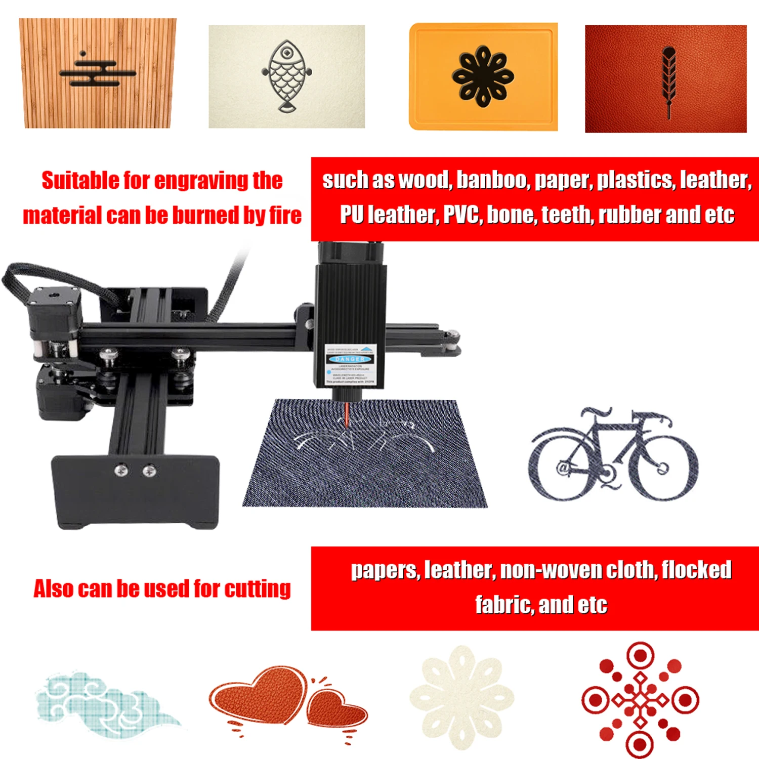 Подходит для гравировки материала может быть сгорел от огня, таких как дерево, банбу, бумага, пластик, кожа, искусственная кожа, ПВХ, кость, резина и т. Д.
