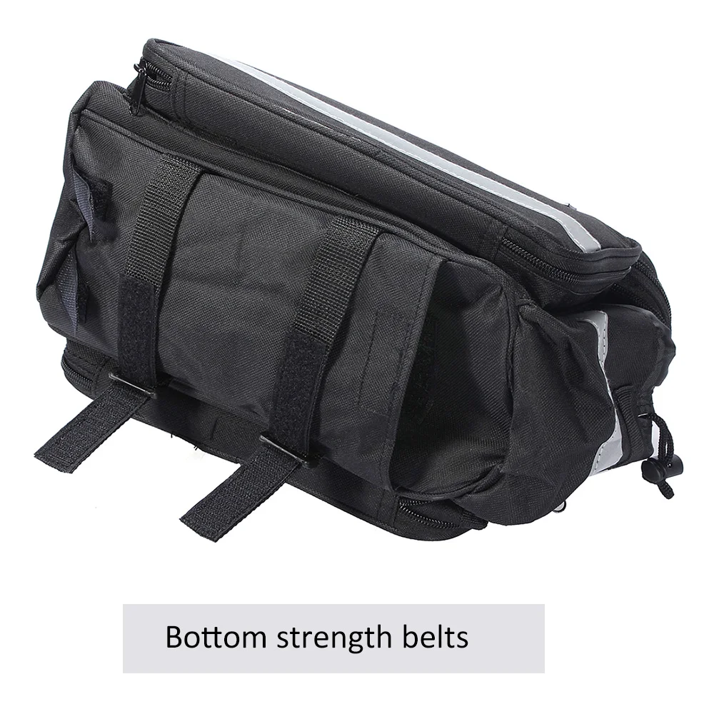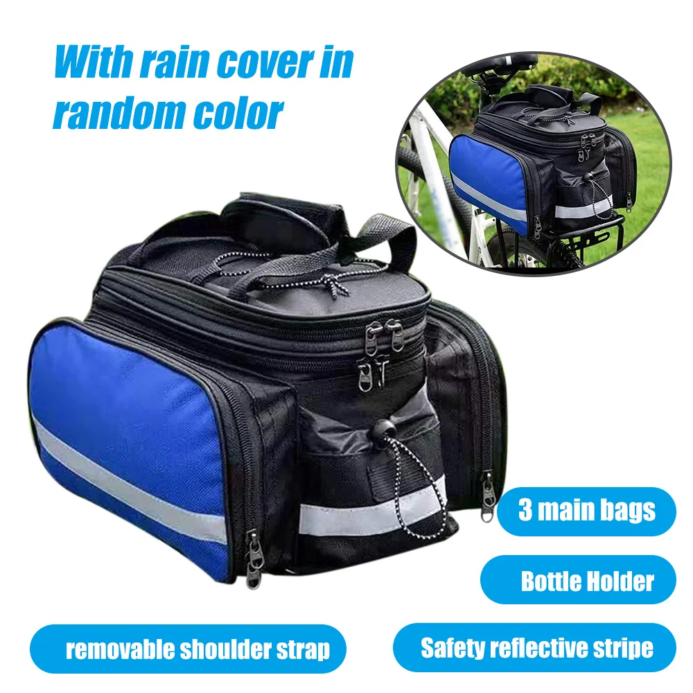 Особенности: Со светоотражающими полосками для безопасности. Состоит из 3 основных частей: две боковые растяжимые сумки и одна Средняя сумка. Один мягкий съемный отсек для средней сумки. Внутри и снаружи сетчатые мешки на верхней крышке. Поставляется со съемными и регулируемыми плечевыми ремнями. (длина: Макс. 1,25 m / 4.1ft) Верхняя рукоятка с накладкой. Полностью оснащенный 2 way застежка-молния. Держатель бутылки на одной стороне с регулируемым поясом. Поставляется с дождевой крышкой (в случайном цвете), прикрепленной в нижней части. Быстро Отпустите или прикрепите велосипедную стойку bys и taches.