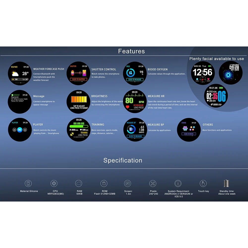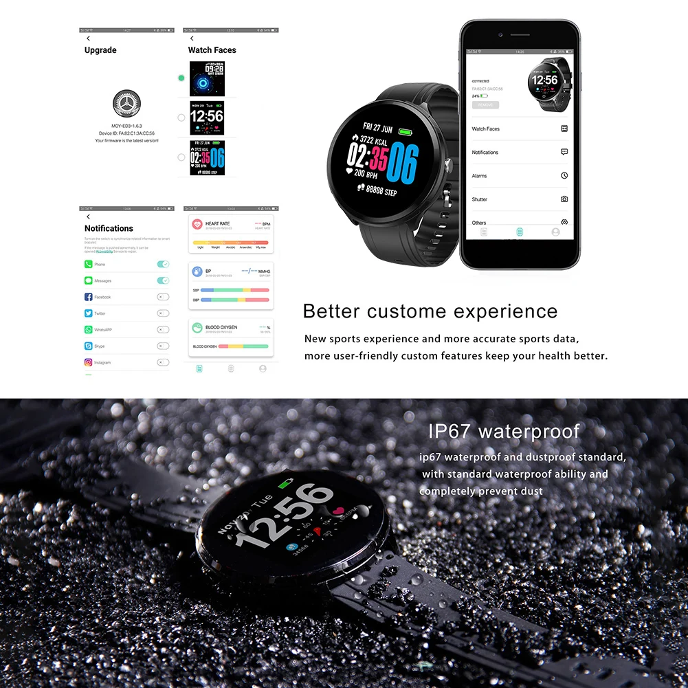 4. Водонепроницаемый IP67. Здоровье при кровяном давлении, кислороде в крови, динамическом мониторе сердечного ритма, мониторе сна. Спорт для бега, велоспорта, баскетбола, плавания, скалолазания и т. д. Все режимы поддерживают время движения, потребление калорий и частоту сердечных сокращений.