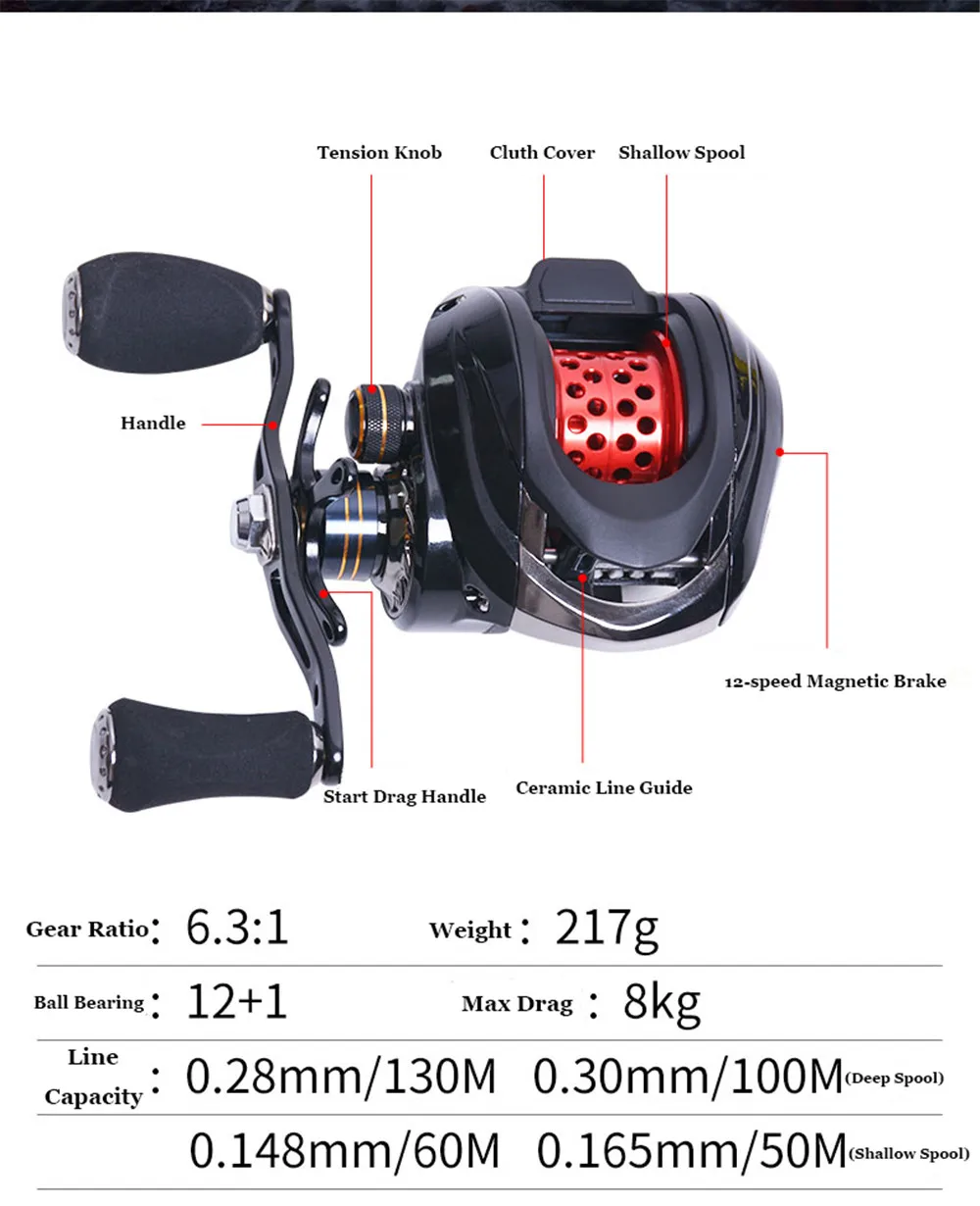 Рыболовная катушка для заброса приманки, 12 + 1 шарикоподшипников, передаточное число 6,3: 1, максимальная нагрузка 8 кг, двойная металлическая катушка, Рыболовные катушки для морской воды