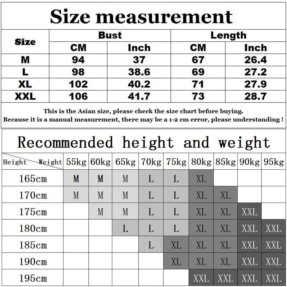 1. Поскольку форма тела каждого человека отличается, рекомендуемый рост и вес могут использоваться только в качестве справочной информации. 2. Если ваш рост и вес между 2 размерами, пожалуйста, выберите больший размер. 3. Если вы не уверены, какой размер выбрать, пожалуйста, свяжитесь с нами. 4. Информация о размере измеряется вручную, и возможна погрешность в 1-2 см. 5. Из-за световых эффектов, настроек яркости/контрастности монитора и т. д. могут быть некоторые незначительные различия в цветовом тоне фотографий и фактического товара!