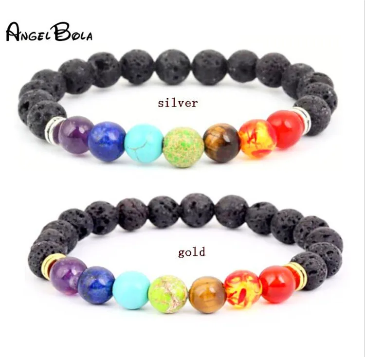 8 мм вулканическая лава камень 7 Чакра браслет, цвет: золото/серебро. Вулканическая лава-камень можно капать духами или эфирным маслом в соответствии с вашими предпочтениями. Оживить в пространстве любви
