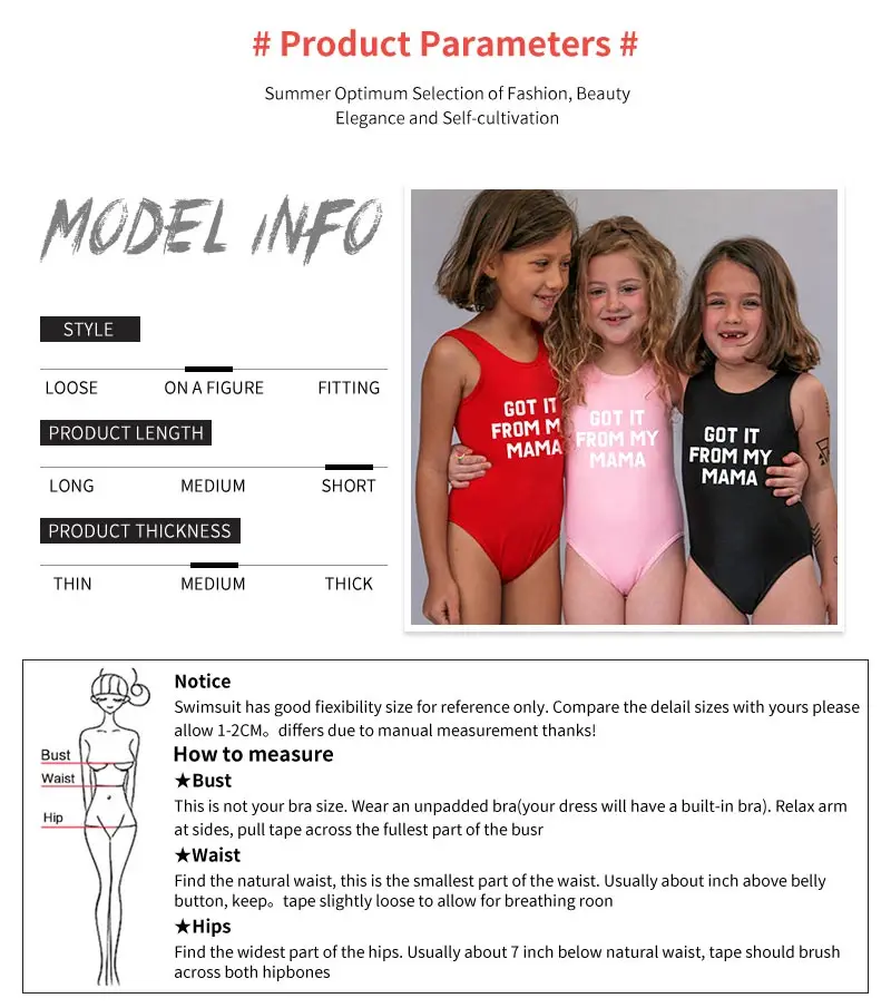 Note : Mom and kids swimswear are of different prices. One price for one swimswear Product Name : swimswear Weight : About 0.12-0.3kg / pcs. Fabric : 95%cotton, 5%Spandex Packaging : 1 pcs packed in 1 bag Brand : MVUPP Color :black red pink Mom size : S-M-L-XL Kids size : (2T/3T) (4T/5T) 6T (7T/8T ) (9T/10T)