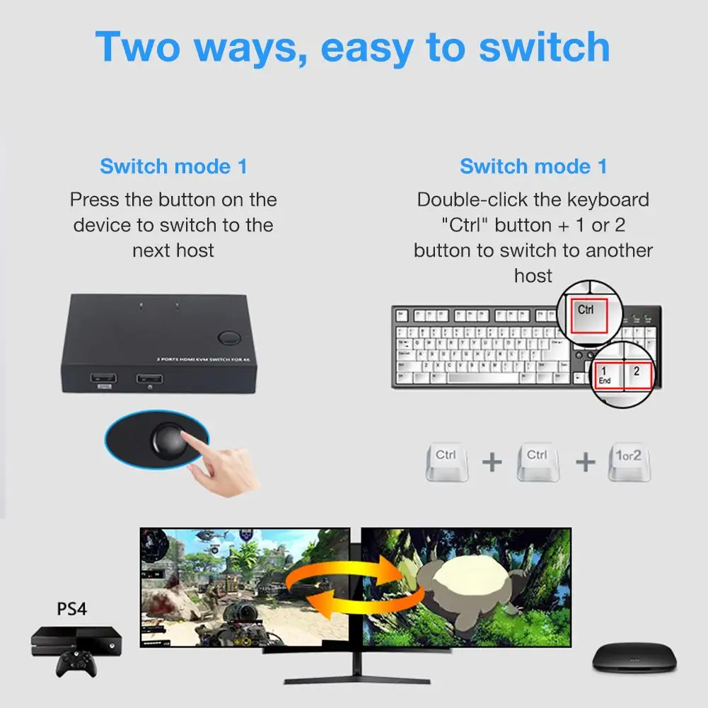 4. Тонкое ремесло: 2 в 1 выход HDMI KVM коммутатор 4K совместим с HDMI 1,4 и HDCP 1,4 и поддерживает разрешение до 4K @ 60 Гц. С этим HDMI переключателем вы можете наслаждаться самым роскошным видео и аудио.