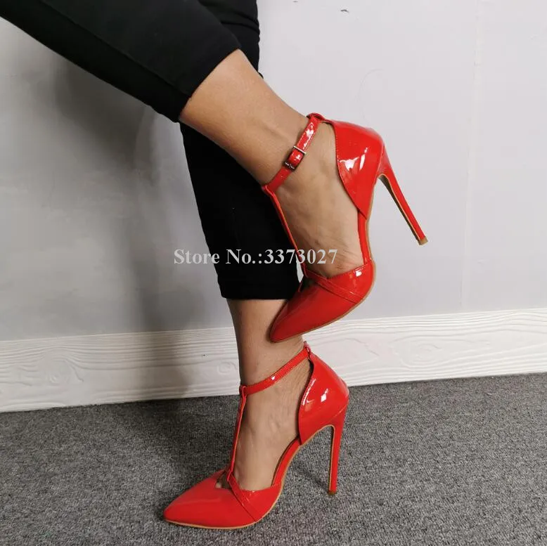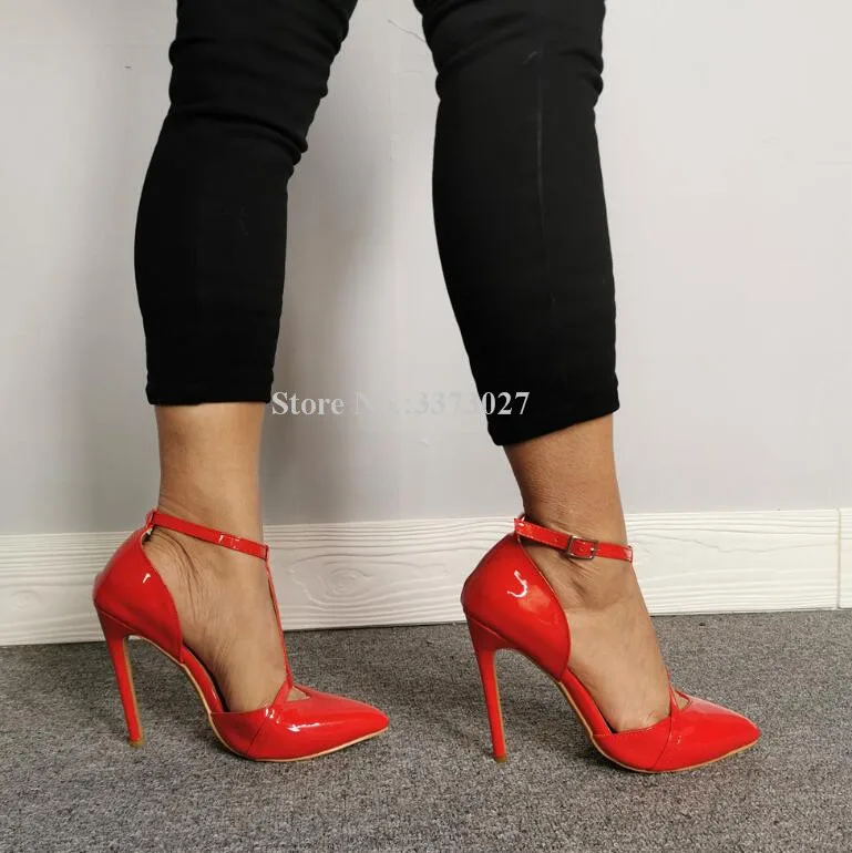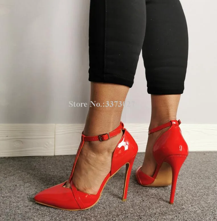 Красные туфли-лодочки из лакированной кожи на шпильках с Т-образным ремешком новые женские модные тонкие туфли с острым носком и пряжкой на лодыжке женские вечерние туфли с реальными фотографиями Прямая поставка