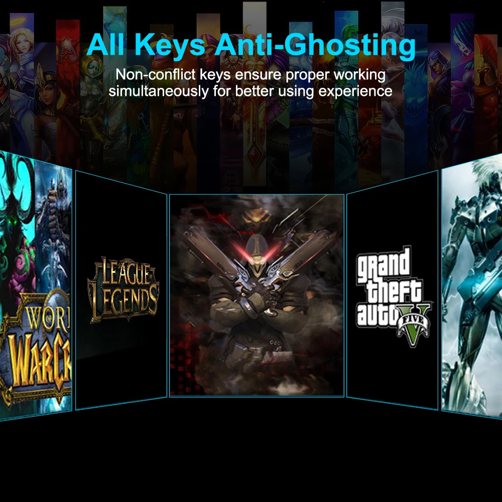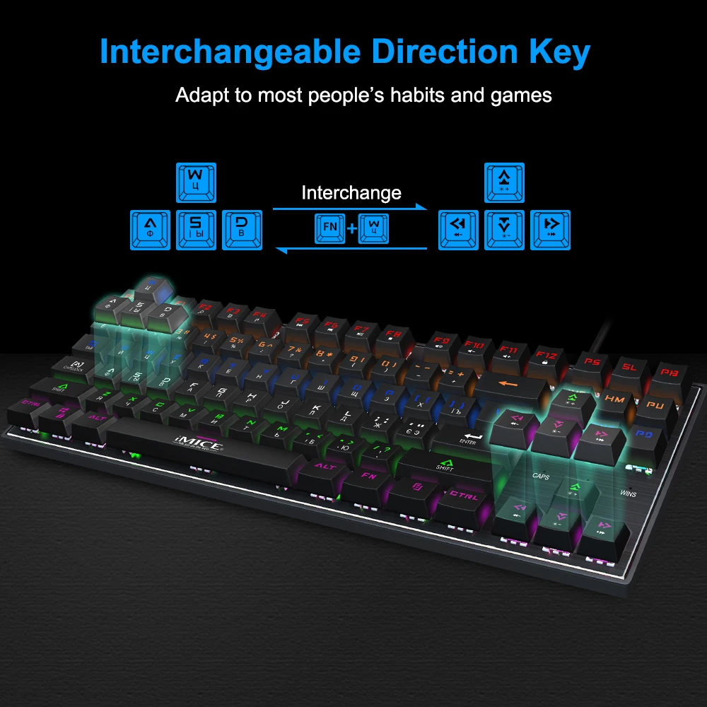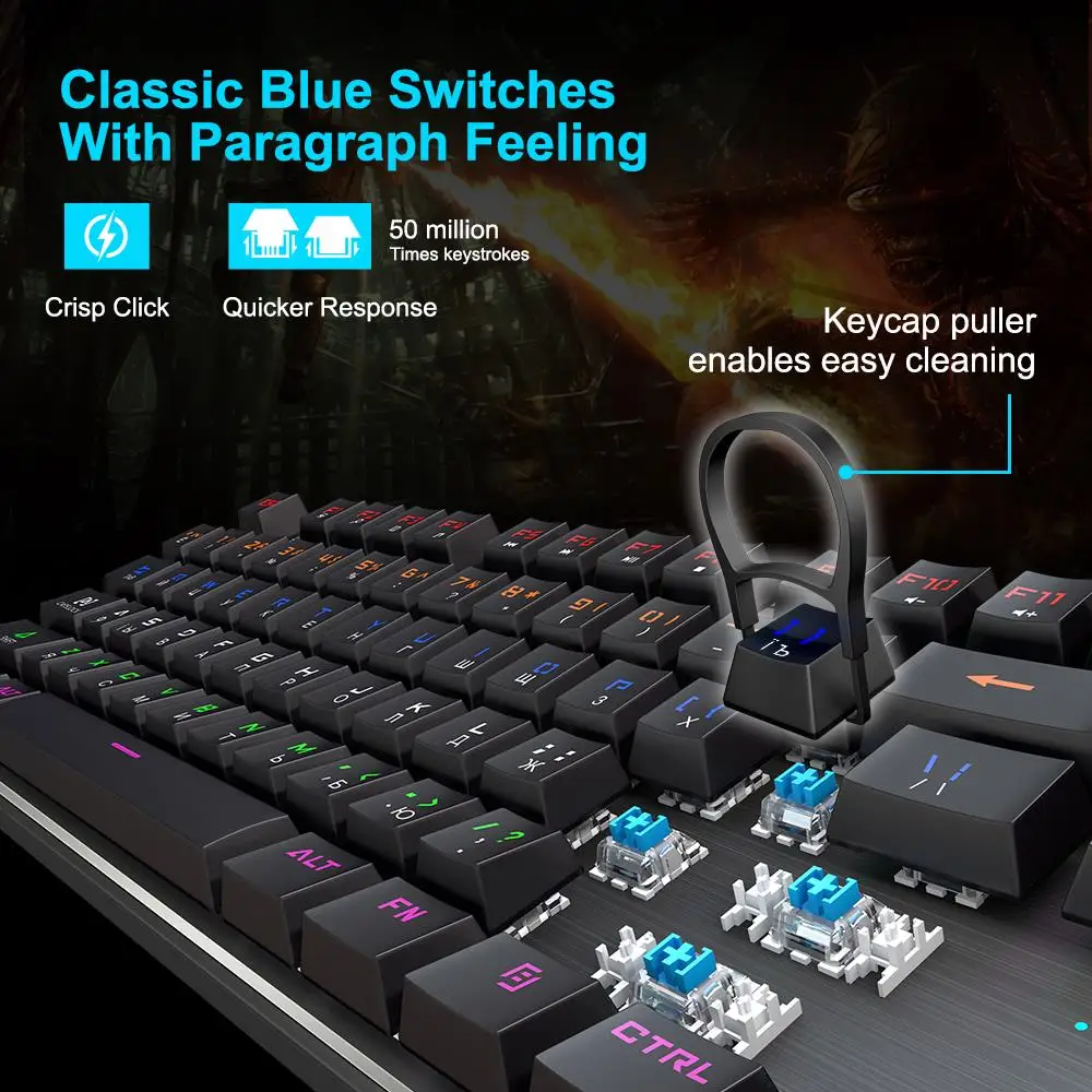 1: Тип клавиатуры: Механическая клавиатура 2: порт подключения: USB plug and play 3: длина провода: 1,6 м 4: ось клавиатуры: синяя ось 5: Количество клавиш: 104/87 клавиш 6: 87 размер ключа: 365x136x34 мм; 104 размер ключа: 450x140x36mm 6: материал панели: алюминиевый сплав 7: Совместимость: Windows 2000/XP/7/8/10/Vista