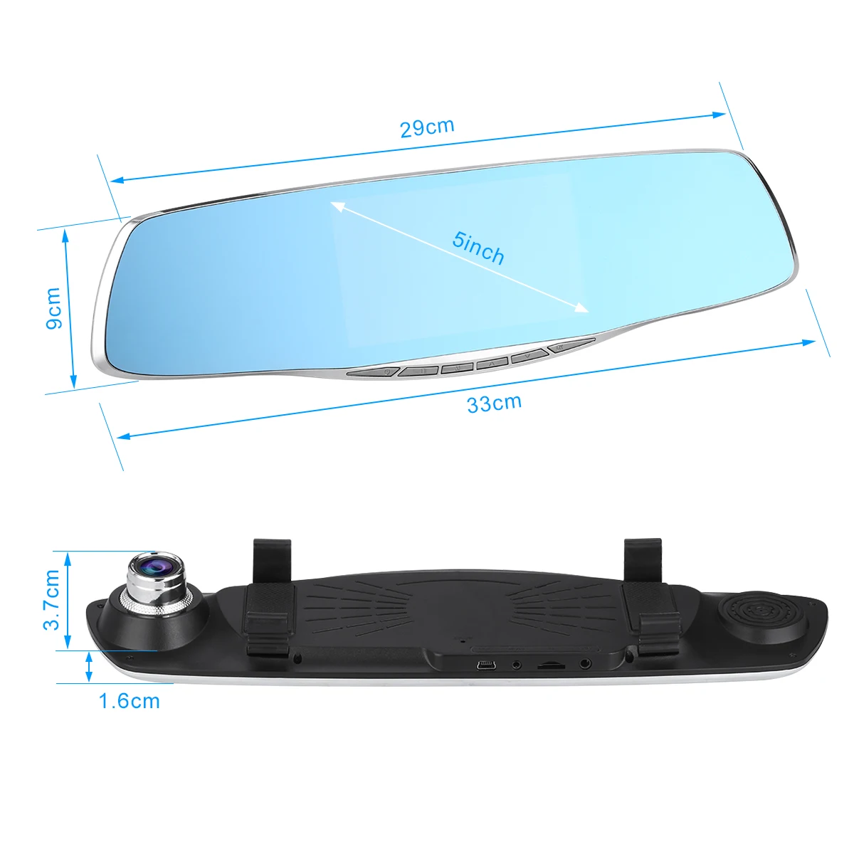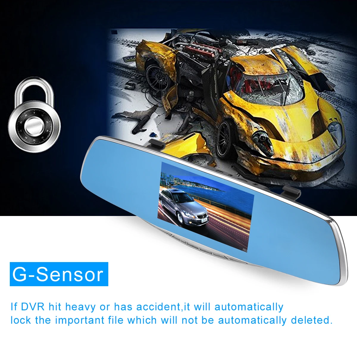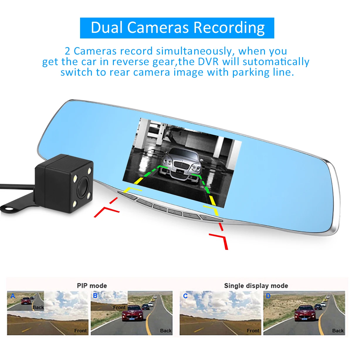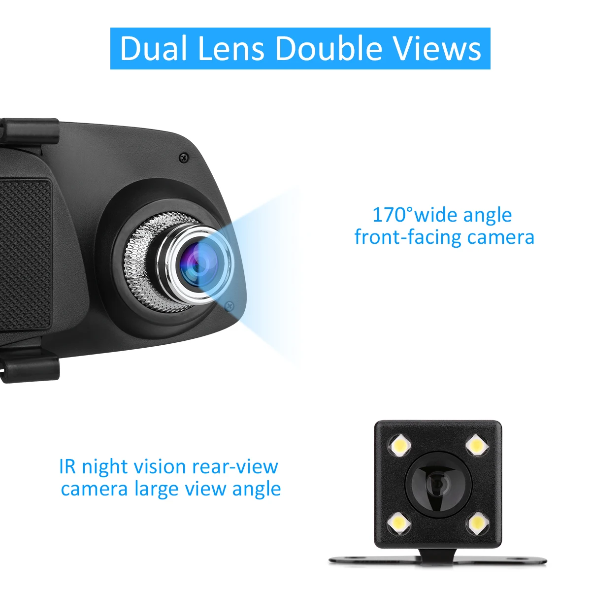 The dual lens camera with 1080P resolution, can record clearer video in the before and after of your car! This dual lens dash camera is mounted to the rearview mirror of your car easily. Installed over, it works just like a regular rearview mirror, and has a Full HD 1080P camera recording everything in the road ahead and behind! Flexible front lens with 170 degree wide angle allows you to adjust the camera angle easily in real time, and back lens to ensure the rear safety!