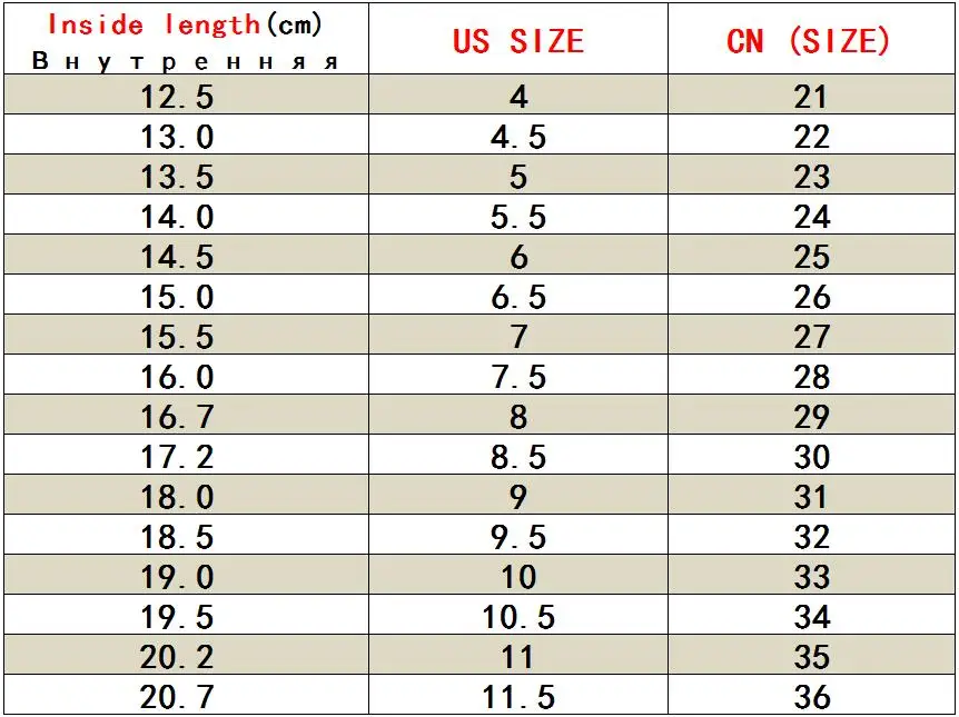 1: американский размер не является стандартным, просто удобно для вас делать заказ. Пожалуйста, выберите размер в зависимости от внутренней длины. В обуви есть только китайские размеры. При получении товара, пожалуйста, обратитесь к китайским размерам 2: Мы не вернем вам деньги, если вы выбрали неправильный размер, пожалуйста, внимательно выбирайте размер. 3: способ выбрать идеальную обувь для ваших детей. Длина стопы + 1 см = Внутренняя длина. Пожалуйста, измерьте длину стопы вашего ребенка, как показано ниже. если длина стопы 11,5 см, Вы можете добавить 1 см. это означает, что выбирайте длину внутри 12,5 см. Спасибо за поддержку. 4: из-за различных методов измерения может быть погрешность около 1 см, это нормально.