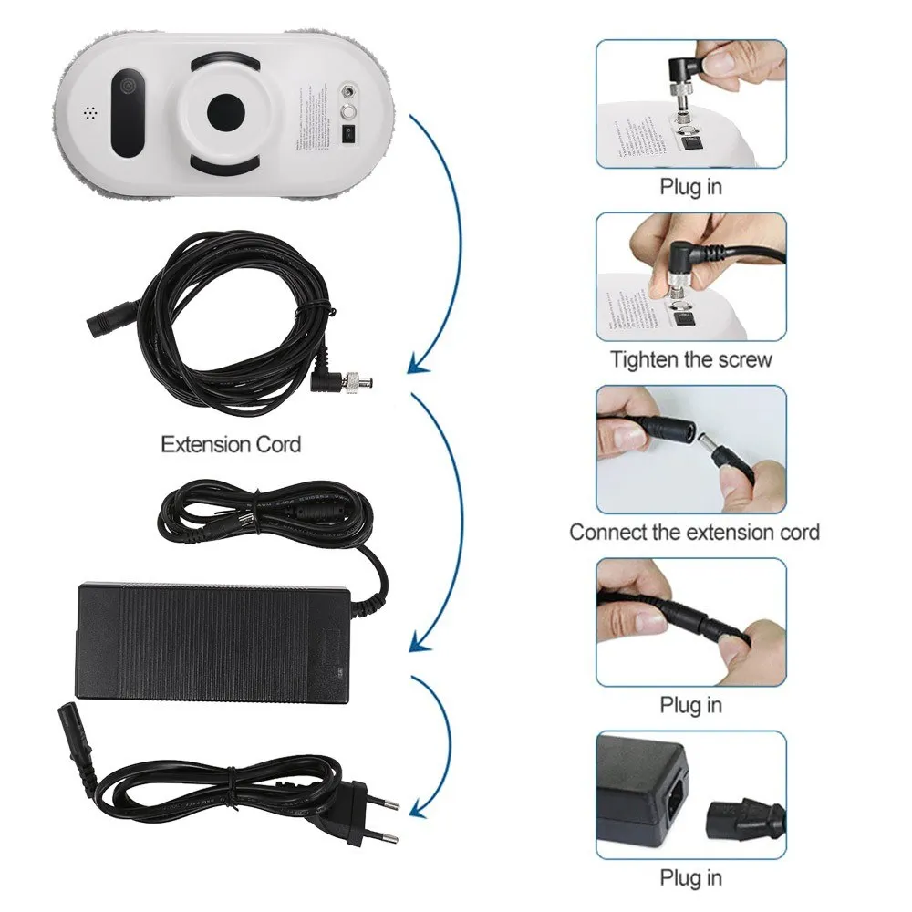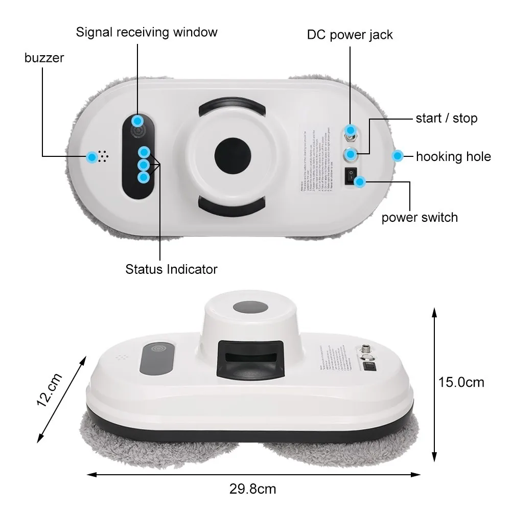 Особенности: Три пути очистки: сначала вверх, затем вниз, сначала влево, затем вниз, сначала справа, затем вниз и вернитесь в исходное положение. Удлинительный шнур 4 м: включает в себя линию питания переменного тока 1 м и удлинитель постоянного тока 4 м, идеально подходит для очень большой очистки окон. Область очистки: очиститель окон может легко очистить стекло в рамке размером меньше 6*5 метров. Анти-падающий Управление: поставляется с 4,5 м с предохранительным тросом и сильной вакуумной абсорбции для противоударной защитой. Функция дистанционного управления: включенный пульт дистанционного управления может контролировать Переключение режима очистки, запуск/остановка. Быстрая скорость чистки: 4 минуты/квадратный метр, скорость очистки (чистите два раза по всему миру), выполняйте уборку с высокой скоростью и высокой производительностью. Макс. 30 минут в режиме ожидания: есть резервная батарея, чтобы предотвратить неожиданный отключение питания. Пожалуйста, подтвердите, что аккумулятор заполнен (зеленый светодиодный). Примечание: 1. Не используйте без оправы, стекла. 2. Закрепите предохранительный трос перед использованием, чтобы предотвратить выпадение с большой высоты. 3. Сначала Включите, а затем поместите робота на стекло окна. 4. Убедитесь, что устройство прочно адсорбируется на стекле, а затем отпустите, это займет около 20 секунд. 5. После окончательной очистки, сначала снимите устройство для очистки окон, а затем выключите устройство. 6. Не используйте его в дождливую или влажную погоду. 7. Пожалуйста, внимательно прочитайте руководство пользователя перед использованием продукта. Технические характеристики: Мощность: 80 Вт Вход Напряжение: AC100-240V В переменного тока, 50/60 Гц Выход: DC24V, 3.75A Скорость чистки: 4 минуты/квадратный метр Максимальная площадь уборки: 6*5 метров Режим очистки: ручная и автоматическая Емкость аккумулятора: 650 мАч Время работы аккумулятора: 20-30 минут Время работы после отключения питания: макс. 30 минут Пульт дистанционного управления, питание от: 2 аккумулятора * AAA (не входит в комплект) Уровень шума: ≤ 60 дБ Размер изделия: 298*150*120 мм/11,73*5,90*4,72 дюйма Вес изделия: 1034 г/2,28 фунтов Размер посылка: 300*232*130 мм/11,81*9,13*5,12 дюймов Вес посылка: 1911 г/4,21 фунта Посылка список: 1 * Робот для очистки окон 1 * пульт дистанционного управления 1 * Безопасность веревка 4,5 м 2 * кольцо на присоске 5 * пар запасной тряпки для чистки 1 бутылка с распылителем 1 * Адаптер переменного тока 1 * Мощность Line-1M 1 * Удлинительный Cord-4M
