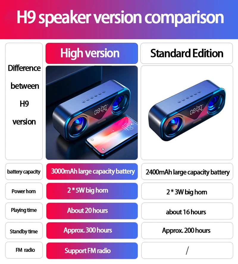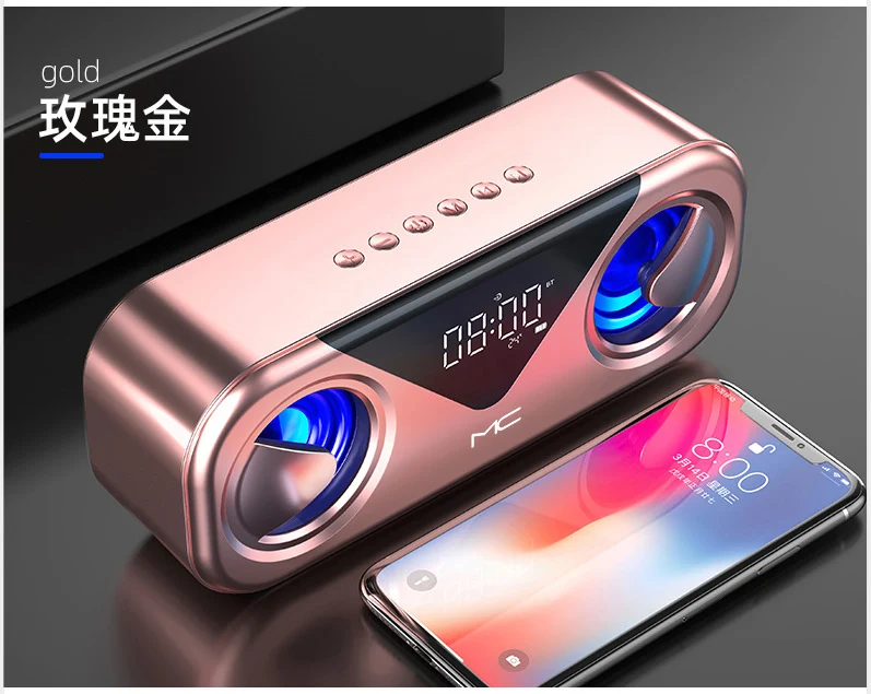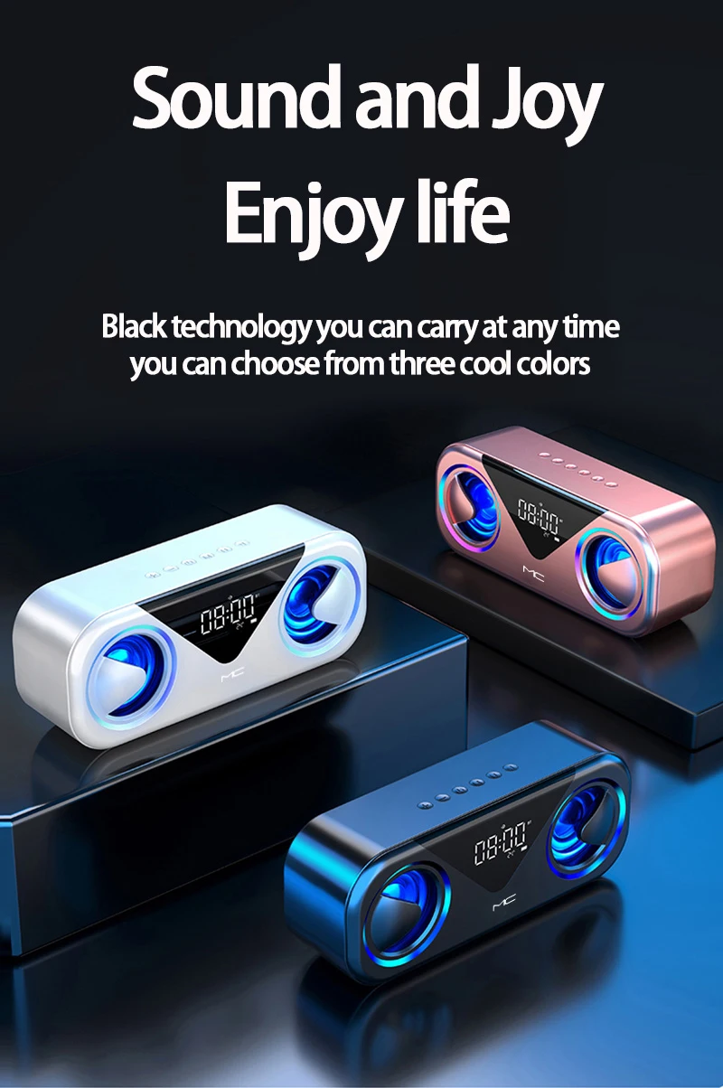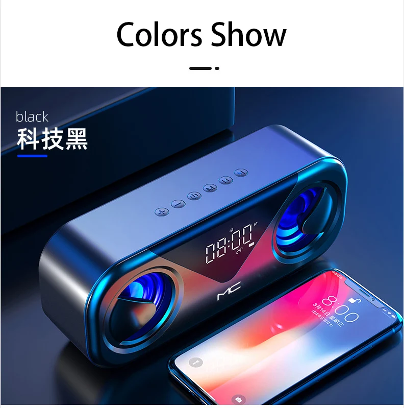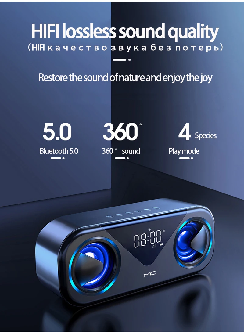 Модный классный светодиодный светильник. 5 Вт * 2 большая мощность с басовой диафрагмой. Аккумулятор 3000 мАч обеспечивает до 20 часов воспроизведения при 2/3 громкости на полном заряде. Bluetooth 5,0, Автоматическое Сопряжение при включении, с дальностью подключения более 10 метров, вы можете наслаждаться музыкой свободно, совместимо со всеми устройствами Bluetooth. Светодиодный экран. Поддержка будильника. Поддержка отображения температуры в реальном времени. Поддержка FM-радио, вы можете напрямую искать радиостанцию в зоне прослушивания. Поддержка TF-карт или SD-карт misro до 32G, поддержка AUX, поддержка USB 2,0 Disk.