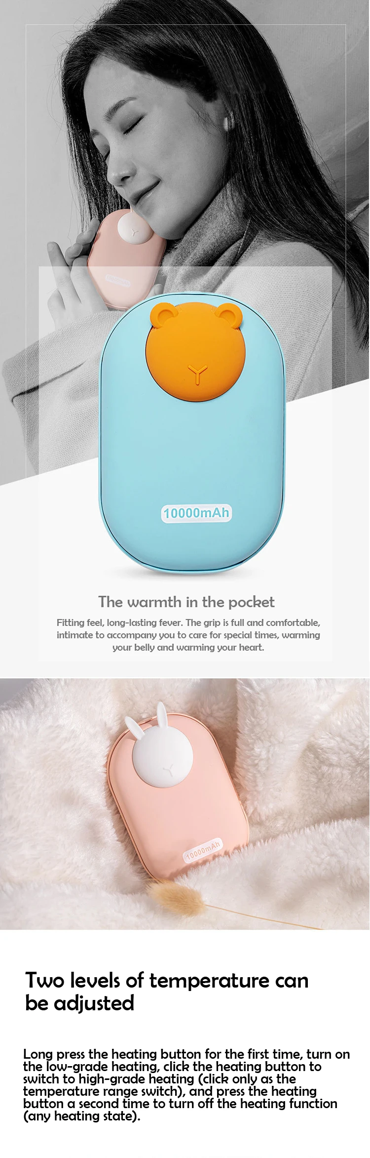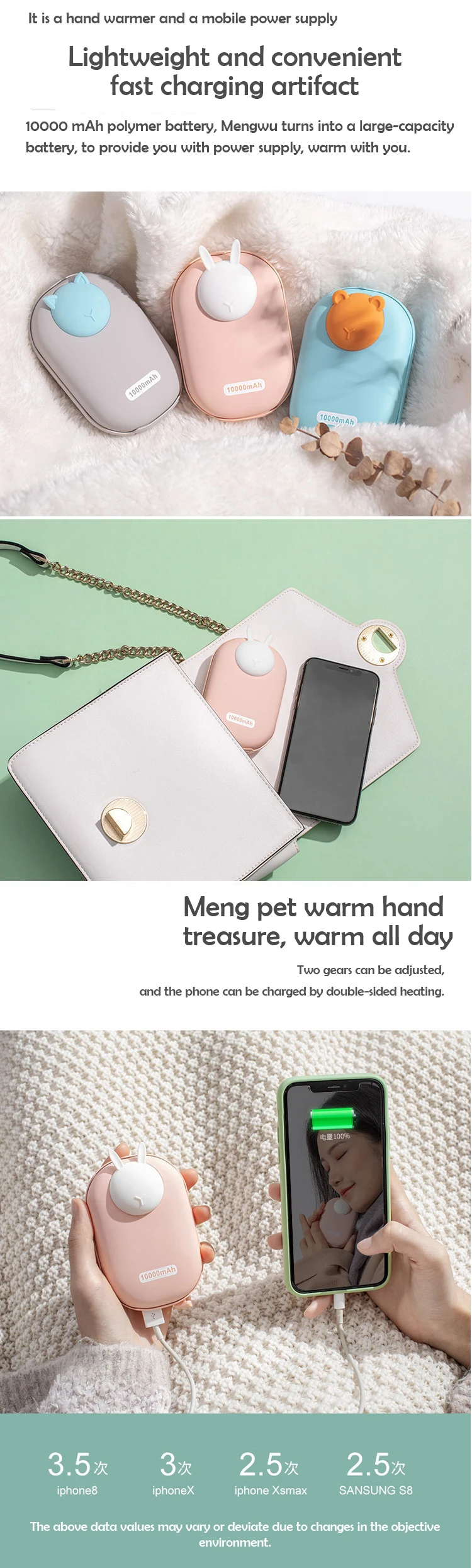 Рабочее напряжение: DC5V Мощность использования: ≥ 18 Вт Входное/Входное напряжение: DC5V Рабочий ток: нагрев ≥ 3000ма ± 10%/выход USB ≥ 3500ма ± 10% Емкость аккумулятора: 10000 мАч Мощность аккумулятора: 37 Вт В комплект входит: грелка для рук, кабель для передачи данных, руководство, ремешок, бархатная сумка