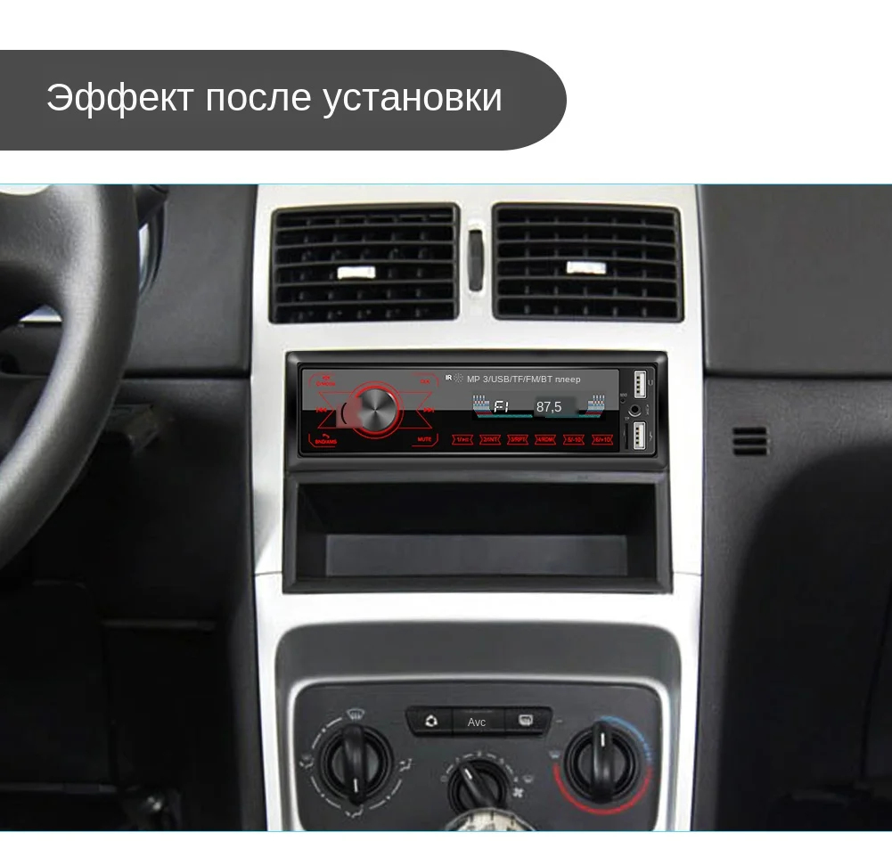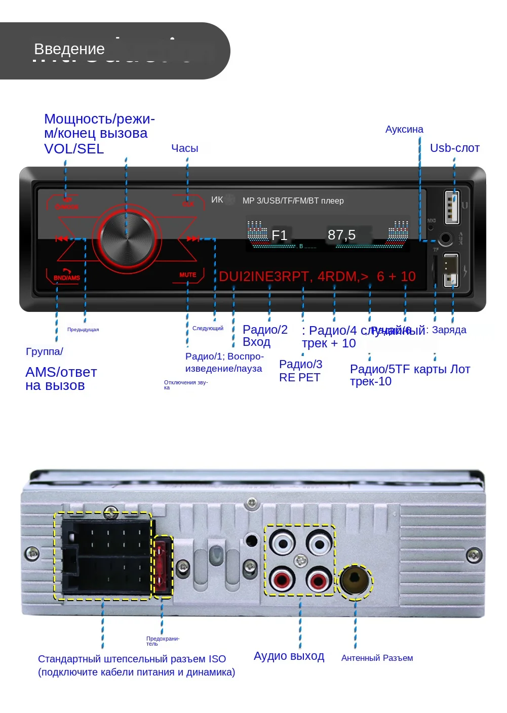 Интерфейс USB и количество: 2 порта (USB 1: чтение музыки на u-диске; USB 2: Зарядка мобильных телефонов)