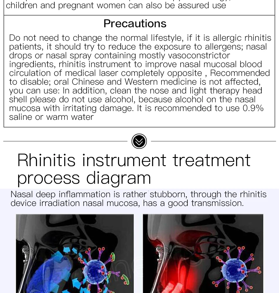 1. Лазерный рихайнит терапевтический аппарат основан на современной медицине и клинической практике исследований и разработки полупроводникового лазерного терапевтического инструмента, прибор принимает полупроводниковый светильник с длиной волны 660 нм, 8-12 мВт низкая видимая интенсивность лазера, лечение облучения в носовой полости, активация физиологии крови.