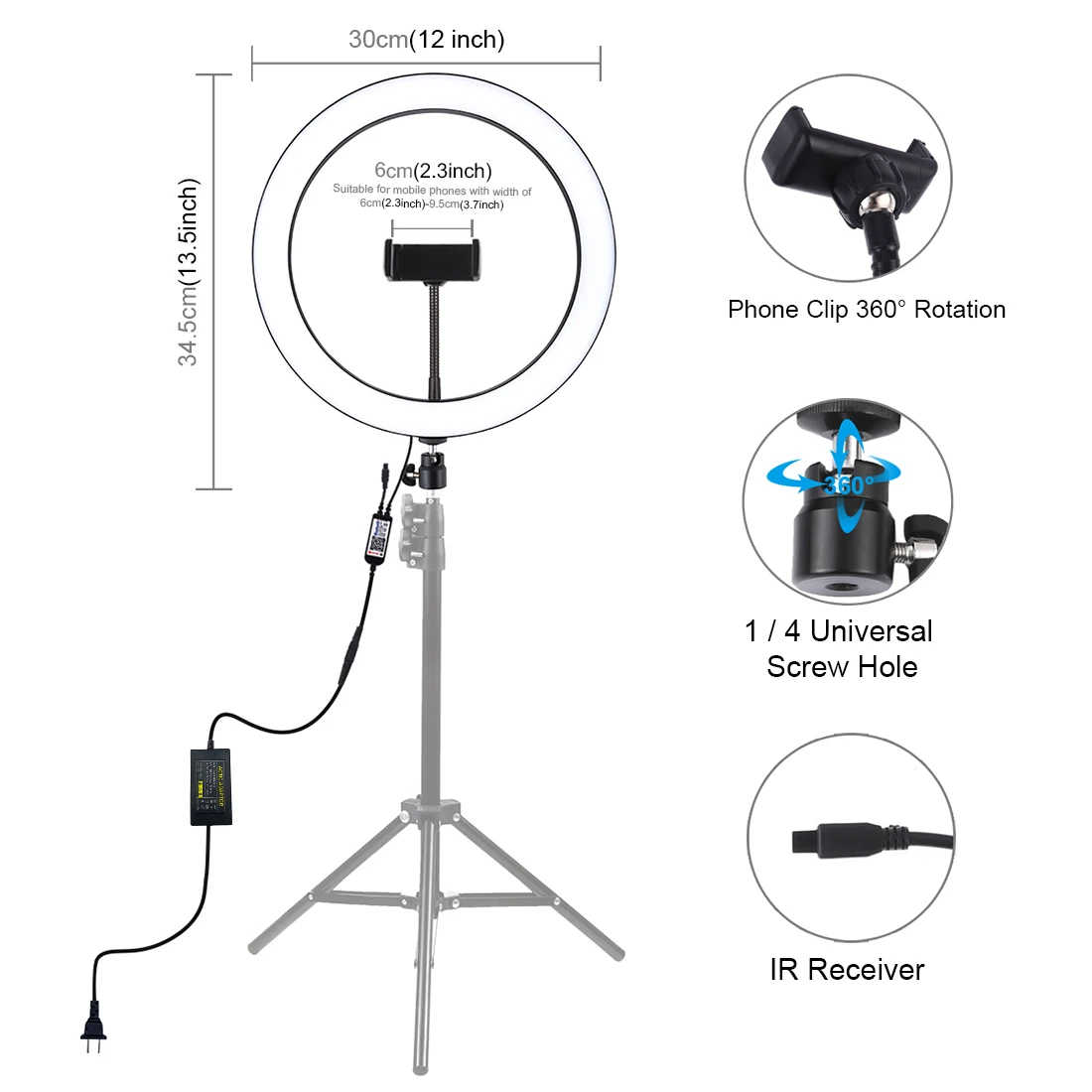 1. Светодиодный кольцевой светильник можно установить на держатель и взять его в любом месте, его также можно снять с подставки в любое время, шаровая Головка штатива может вращаться на 360 градусов, можно свободно регулировать под любым углом (держатель не входит в комплект).