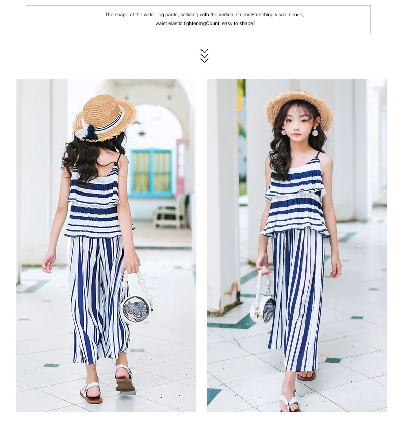 Комплект летней шифоновой одежды для девочек-подростков, комплект детской одежды 2020, топ на бретельках + свободные штаны в полоску, комплект детской одежды из 2 предметов для 6-16 лет