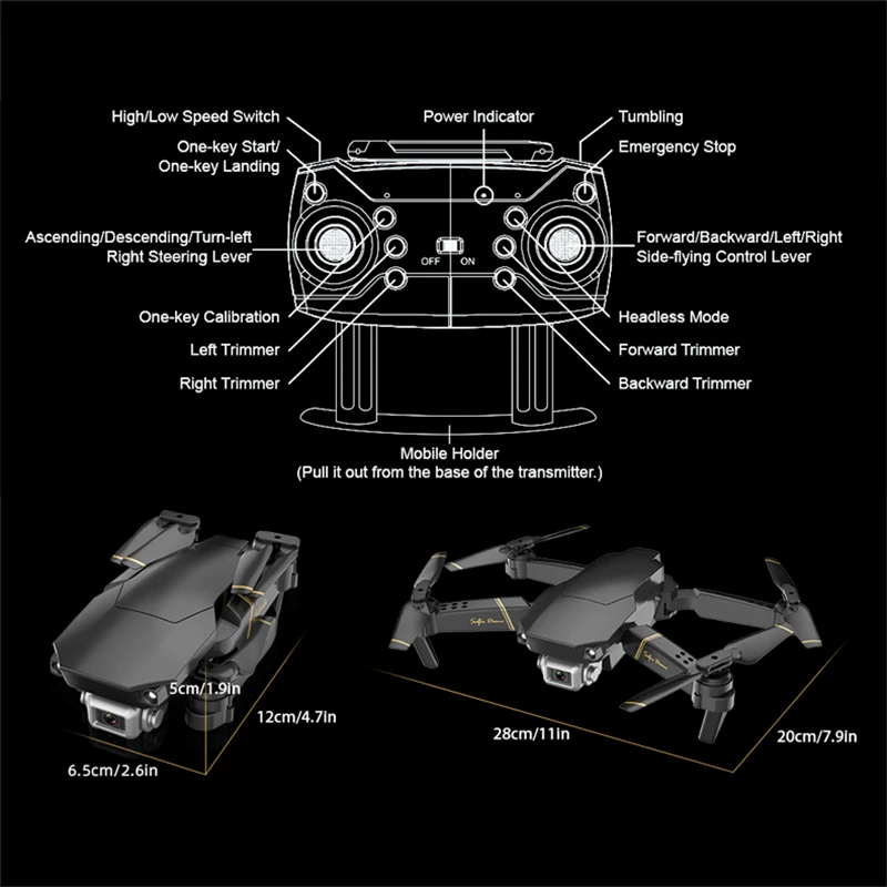 Частота: 2,4G Канал: 4CH G-yro: 6 осей Квадрокоптер Батарея: 3,7 V 1200mAh литий-полимерный (все указанные аккумуляторы входят в комплект поставки) Передатчик Батарея: 3x1,5 AA Батарея (не входит в комплект) Время полета: 12-15 минут Время зарядки: 100-130 минут Расстояние R/C: 80-100 м Летающий Вес: около 250 г (с аккумулятором) Цвет: черный Камера на выбор: 1080P Пиксель: 1080P-изображение: 1920*1088, видео: 1280*720 (сохранено на мобильный телефон) Расстояние Wi-Fi: 50-70 м Размер Quad: 28*20*5 см (руки не сложены) Размер: 12*6,5*5 см (руки в сложенном виде) Функция: вверх/вниз, вперед/назад, поворот влево/вправо, поворот влево/вправо, бока, f светильник, 3 уровня f светильник скорость, светодиодный светильник, траектории F светильник, режим удержания высоты, «Безголовый» режим возврат одной кнопкой, взлет одной кнопкой/посадка, WiFi FPV, камера/видео