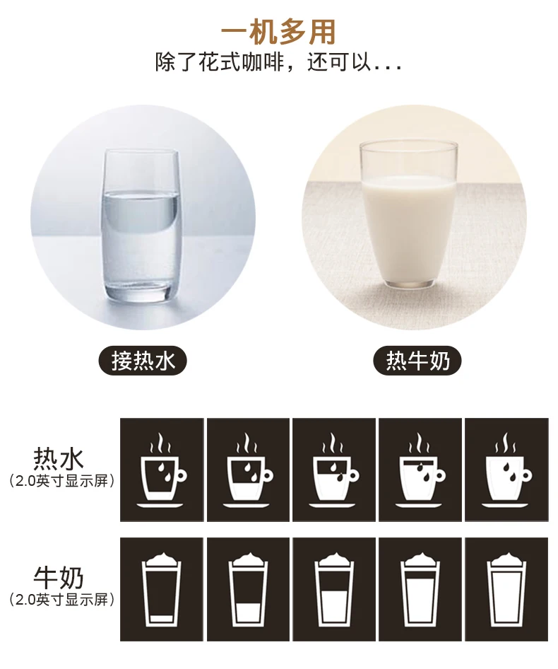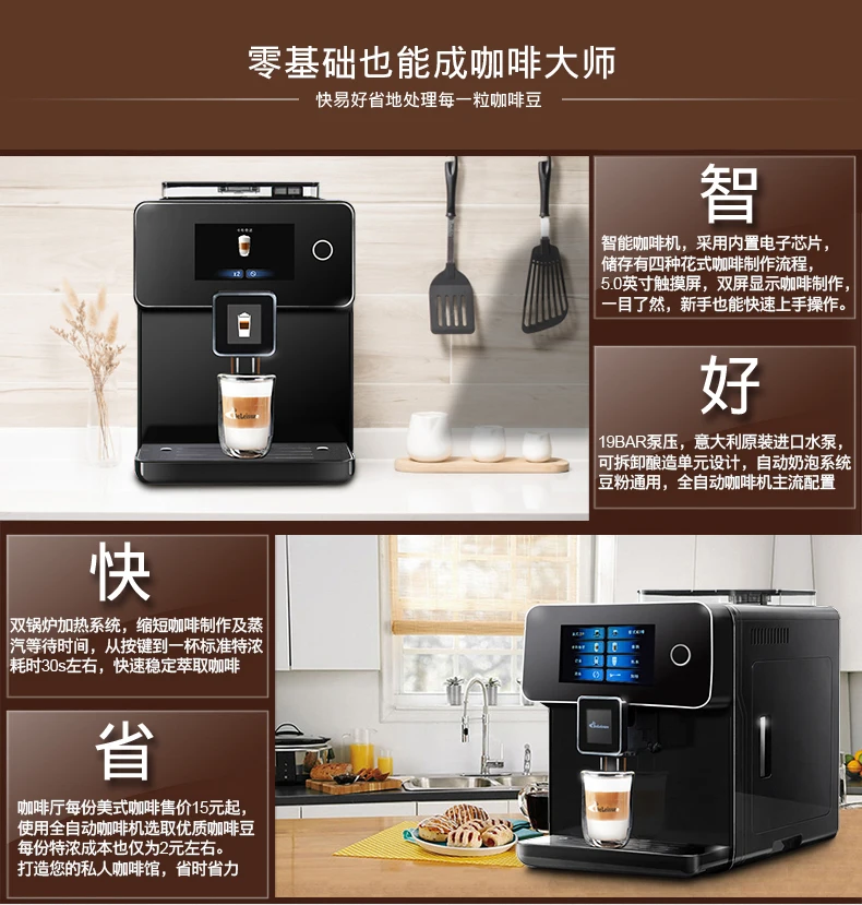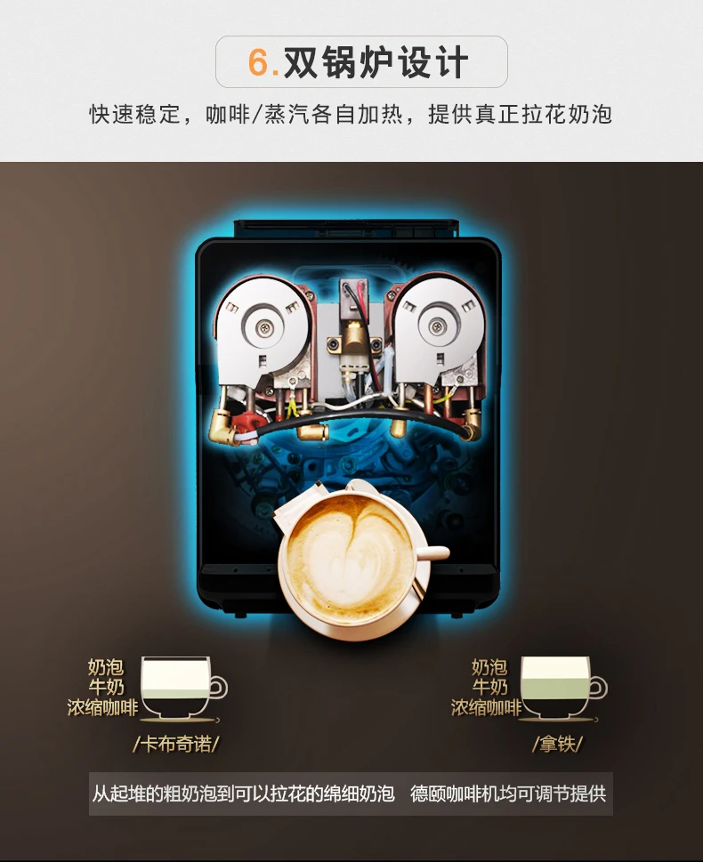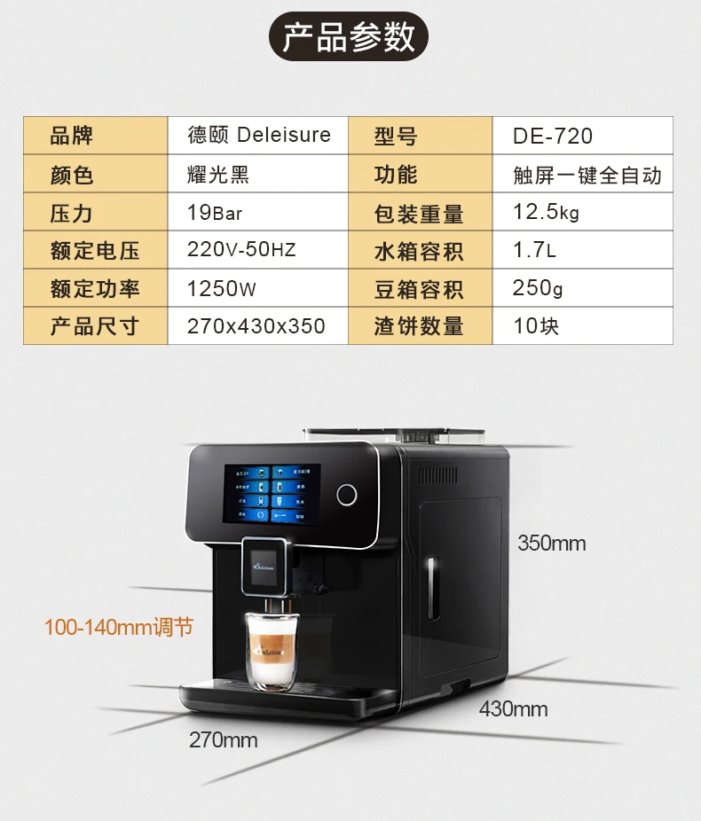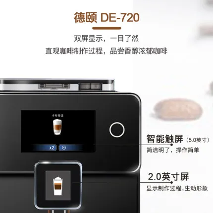 Deyi DE-720 двухцветный экран умный дом автоматическая кофемашина Автоматическая молочная пена один клик капучино Автоматический капучино, латте, американский, кофе эспрессо и т. д. автоматическая мельница с функцией измельчения в один клик Номер сертификата: 2017010717002185 статус сертификата: Действительное Название продукта: полностью автоматическая кофемашина 3C Спецификация модели: DE-720 220 В ~ 50 Гц 1250 Вт Название продукта: кофемашина Deyi DE-720 бренд: модель Deyi: DE-720 Цветовая классификация: черно-белый Использование: автоматическая кофеварка Категория: Накачка Функция: итальянская Автоматическая в итальянском стиле Регулируемое английское меню Машина может приготовить 4 вида кофе одним кликом: Итальянский, американский, латте, капучино, Может производить горячую воду и молочную пену отдельно Популярная Новая Автоматическая Кофемашина DE-720 обладает следующими характеристиками: 1: [двойной экран] Управление сенсорным экраном в одно касание простое, двойной экран, понятный и интуитивно понятный процесс приготовления кофе. 2: [большой сенсорный экран] 2,8-дюймовый сенсорный экран, четкий и четкий дисплей, простота и простота в эксплуатации. 3: используется итальянский водяной насос A R.S с стабильным давлением насоса более 19 бар, см. Сертификационные документы; Добыча масла более ароматна. 4: [обновление ядра] Используйте новый заварник с увеличенным ядром, чтобы увеличить количество измельченной муки до 12 г, увеличить концентрацию заваривания и получить более мягкий вкус. 5: [двойная конструкция котла] независимые паровые и пивоваренные котлы не мешают друг другу, что может эффективно обеспечить непрерывную выработку чашек. 6: [кофе в один клик] вы можете приготовить капучино, латте, американский кофе и кофе эспрессо, нажав на кнопку один раз. 7: [шесть независимых водовыходов] Горячая вода, кофе и молочная пена отделены от стеклянной горловины, тщательно продуманная, привкус не мешает друг другу. Новая популярная Автоматическая Кофемашина DE-720 имеет следующие функции: 1: [регулируемые параметры кофе] непосредственно настраивается в меню: количество кофейного порошка, температура чашки, количество чашки, время вспенивания молока; Регулируемая толщина порошка на складе в зернах; попрощайтесь с кофейным фаст-фудом, выберите свой любимый кофе в одной чашке. 2: [идеальная система пены для молока] можно регулировать в широком диапазоне для выбора состояния молочной пены. От тонкой до твердой молочной пены в различных состояниях, ее можно легко удалить одним кликом! Молочную пену также можно использовать для вытягивания цветов. 3: [30 секунд из чашки] от кнопки к чашке Стандартный эспрессо занимает всего 30 секунд. 4: [Автоматическая система очистки] включите и выключите автоматическую систему трубопровода очистки (для обеспечения гигиены рекомендуется регулярно чистить аппарат для вспенивания молока и пивоварения). 5: [двойное использование зернового порошка]-свежемолотые кофейные зерна, совместимые с имеющимся кофейным порошком (требуется использование кофейного порошка для автоматических кофемашин, добавляя его в контейнер для порошка вручную)