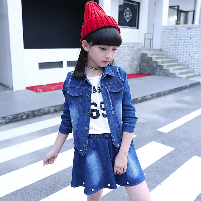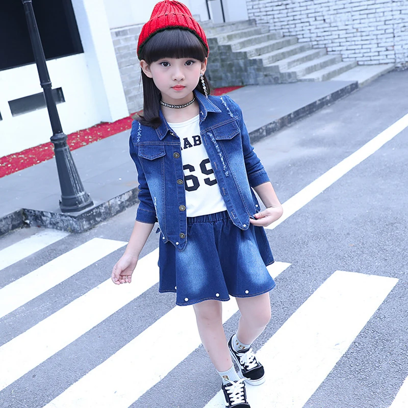 Одежда для девочек Джинсовая модная спортивная куртка из трех предметов + футболка с длинными рукавами + джинсовая юбка средней длины детская одежда высокого качества
