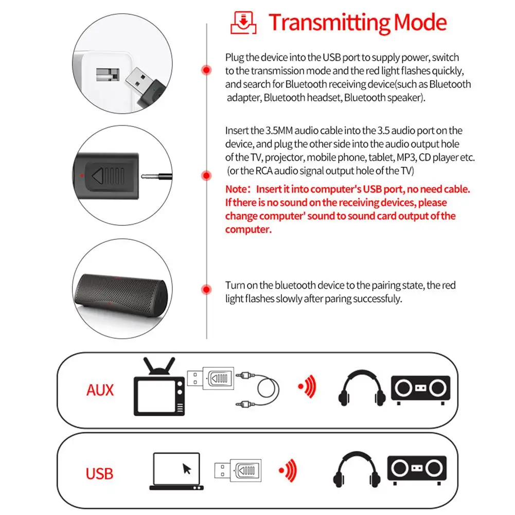 4. Больше никаких запутанных проводов, никаких Растягивающихся кабелей, с любыми устройствами с поддержкой Blueteooth, такими как наушники, динамик, bluetooth-аудио приемник и т. д., чтобы наслаждаться кристально чистой стереомузыкой. С usb-портом вы можете легко подключать и воспроизводить этот передатчик и не нужно какое-либо другое программное обеспечение драйвера, питание от USB, также нет ограничений по времени.