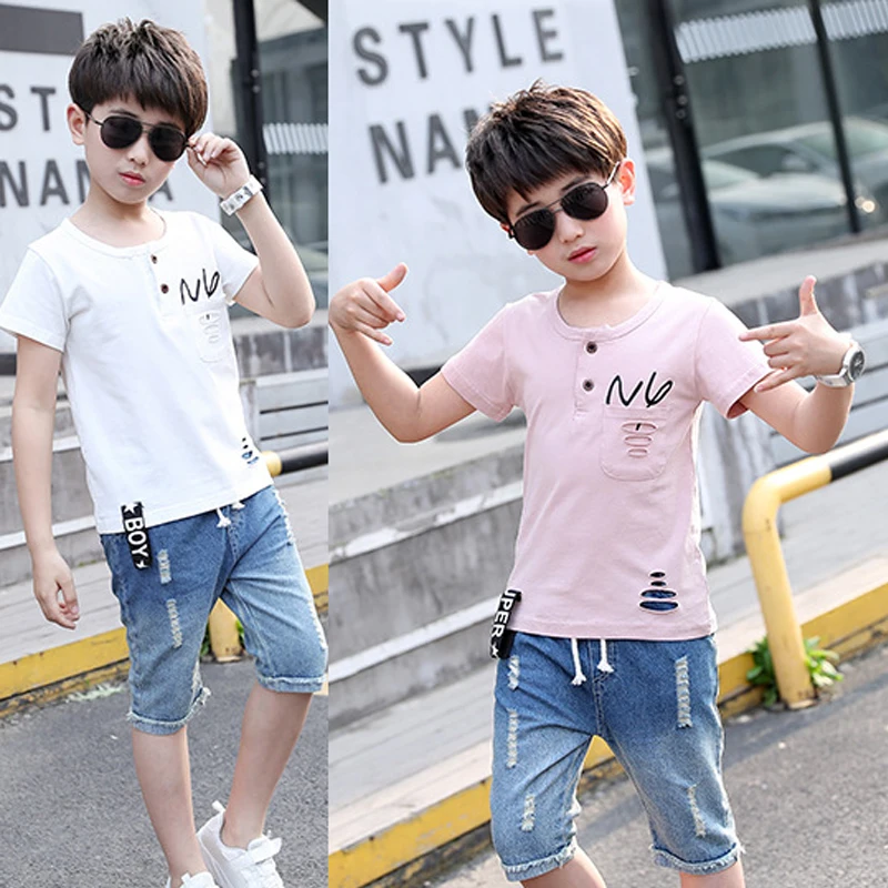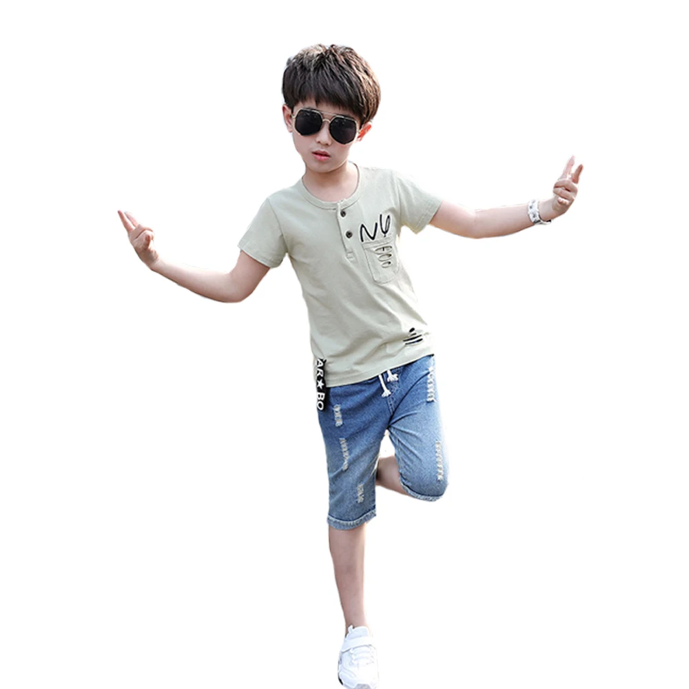 Детская одежда, летняя футболка с короткими рукавами, джинсы, потертая одежда из двух предметов для мальчиков, 2020, горячая Распродажа, качественная одежда для детей 4-12 лет