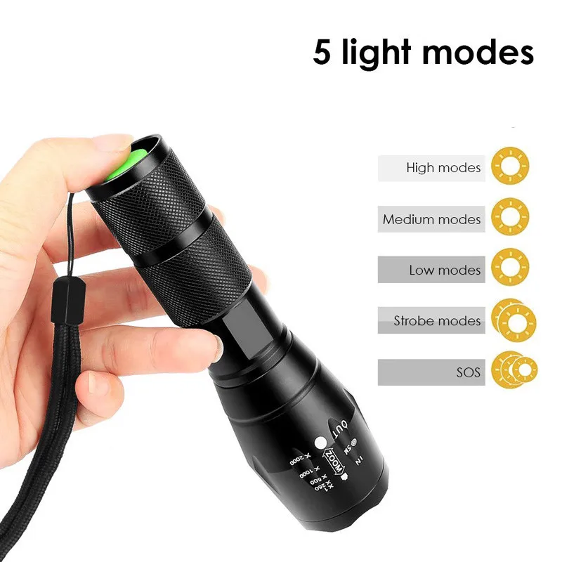 1. Корпус этого фонарика изготовлен из высококачественного алюминиевого сплава, и он имеет очень прочную конструкцию 2. Внутренняя проводка применяет высокоэффективный усилитель цепи, и может использовать батареи в большой степени 3. Отличный водонепроницаемый, подходит для наружной среды, неблагоприятных погодных условий, за исключением дайвинга 4. Функция фокусировки, позволяющая фокусировать луч. Технические характеристики: 1. Модель: E17 2. Тип эмиттера: T6/L2/V6 4. Количество ламп: 1 5. Светильник: холодный белый 6. Светодиодный чип на плате) Срок службы: 100000 часов 7. Режимы: 5 8. Расположение режима: Высокий> Средний> Низкий> стробоскоп> Sos> Увеличение и уменьшение 9. Максимальное расстояние освещения: 500 м 10. Конфигурация батареи: 1*18650/3 x AAA батареи 11. Вход Напряжение: 3,6-4,2 V 13. Тип переключателя: Clicky/Clickie 14. Расположение переключателя: Хвостовая крышка 15. Линза: выпуклая линза 16. Специальный Особенности: Масштабируемые 17. Материал: Алюминий из алюминиевого сплава 18. Цвет: черный
