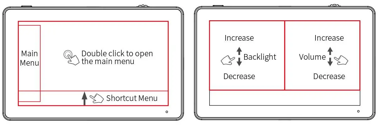 1. Когда монитор и касание включены, непрерывно нажимайте на экран дважды, чтобы войти в главное меню. 2. Нажмите на палец в нижней части экрана, чтобы войти в меню быстрого доступа. 3. На левой стороне экрана (1/2 сплит-экрана), вы можете непосредственно регулировать яркость подсветки экрана; На правой стороне экрана (1/2 сплит-экрана), вы можете напрямую регулировать громкость. 4. Нажмите на любое место рядом с меню, чтобы выйти из меню.