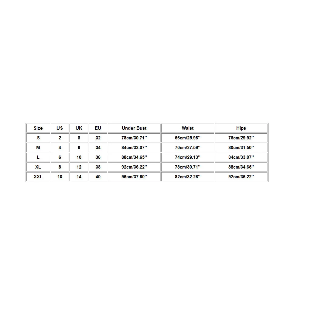 Размер США Великобритания ЕС Под грудью Талия Бедра S 2 6 32 78 см/30,71'' 66 см/25,98'' 76 см/29,92'' М 4 8 34 84 см/33,07'' 70 см/27,56'' 80 см/31,50'' L 6 10 36 88 см/34,65'' 74 см/29,13'' 84 см/33,07'' XL 8 12 38 92 см/36,22'' 78 см/30,71'' 88 см/34,65'' XXL 10 14 40 96 см/37,80'' 82 см/32,28'' 92 см/36,22''