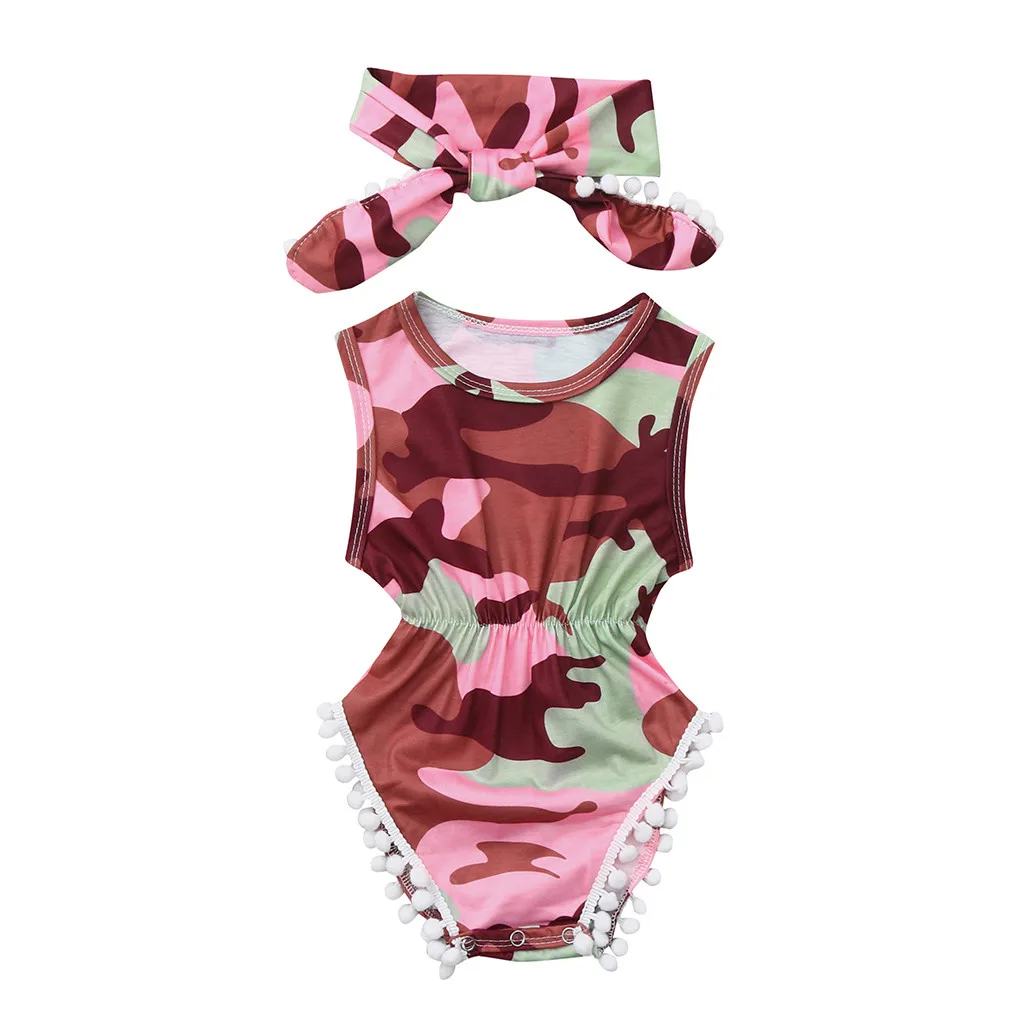 Комплект из 2 предметов; боди для маленьких девочек; летний камуфляжный комбинезон с кисточками для малышей; боди без рукавов + повязка на голову; A40