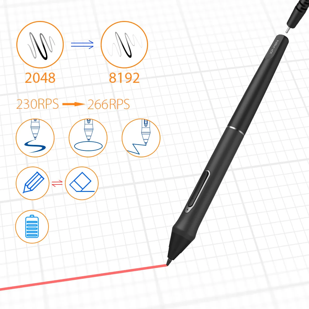 Новейшая технология P02S stylus обеспечивает 8192 уровней чувствительности к давлению, что позволяет создать ваш замечательный кусок с превосходным контролем и потрясающей плавностью. Полная зарядка обеспечивает до двух месяцев наброски, наброски и проектирования.