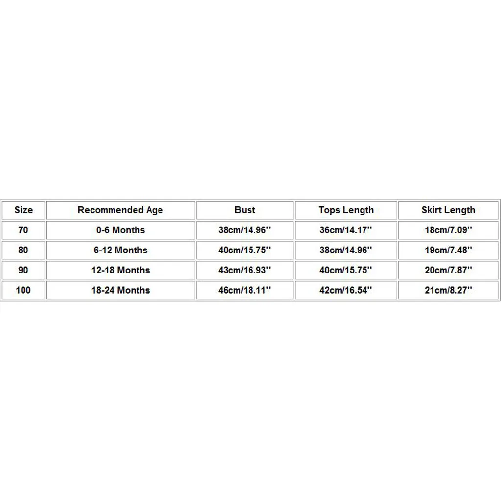Size Recommended Age Bust Tops Length Skirt Length 70 0-6 Months 38cm/14.96'' 36cm/14.17'' 18cm/7.09'' 80 6-12 Months 40cm/15.75'' 38cm/14.96'' 19cm/7.48'' 90 12-18 Months 43cm/16.93'' 40cm/15.75'' 20cm/7.87'' 100 18-24 Months 46cm/18.11'' 42cm/16.54'' 21cm/8.27''