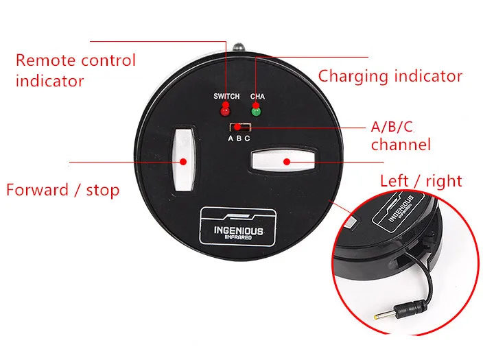 Цвет: черный/красный Материал: пластик Функция: дистанционное управление ползанием (вперед, поворот направо, остановка) Батарея: встроенный аккумулятор 2,4 в 80 мАч металл-гидридных или никель Батарея. Батарея дистанционного управления: 3 батарейки АА (не входят в комплект)