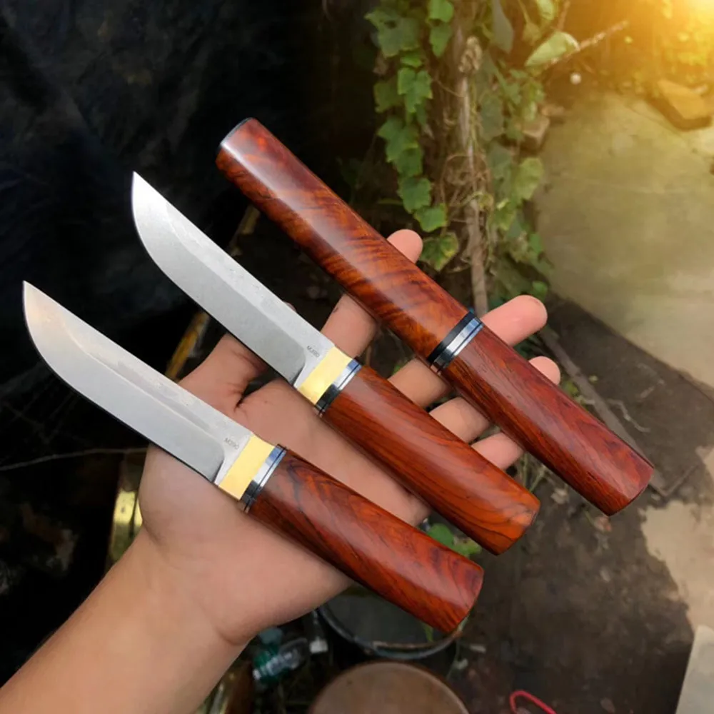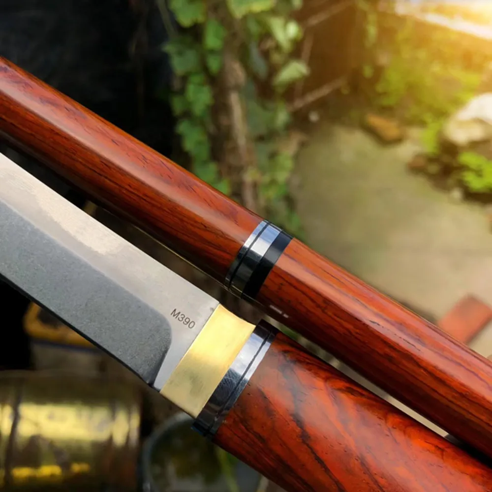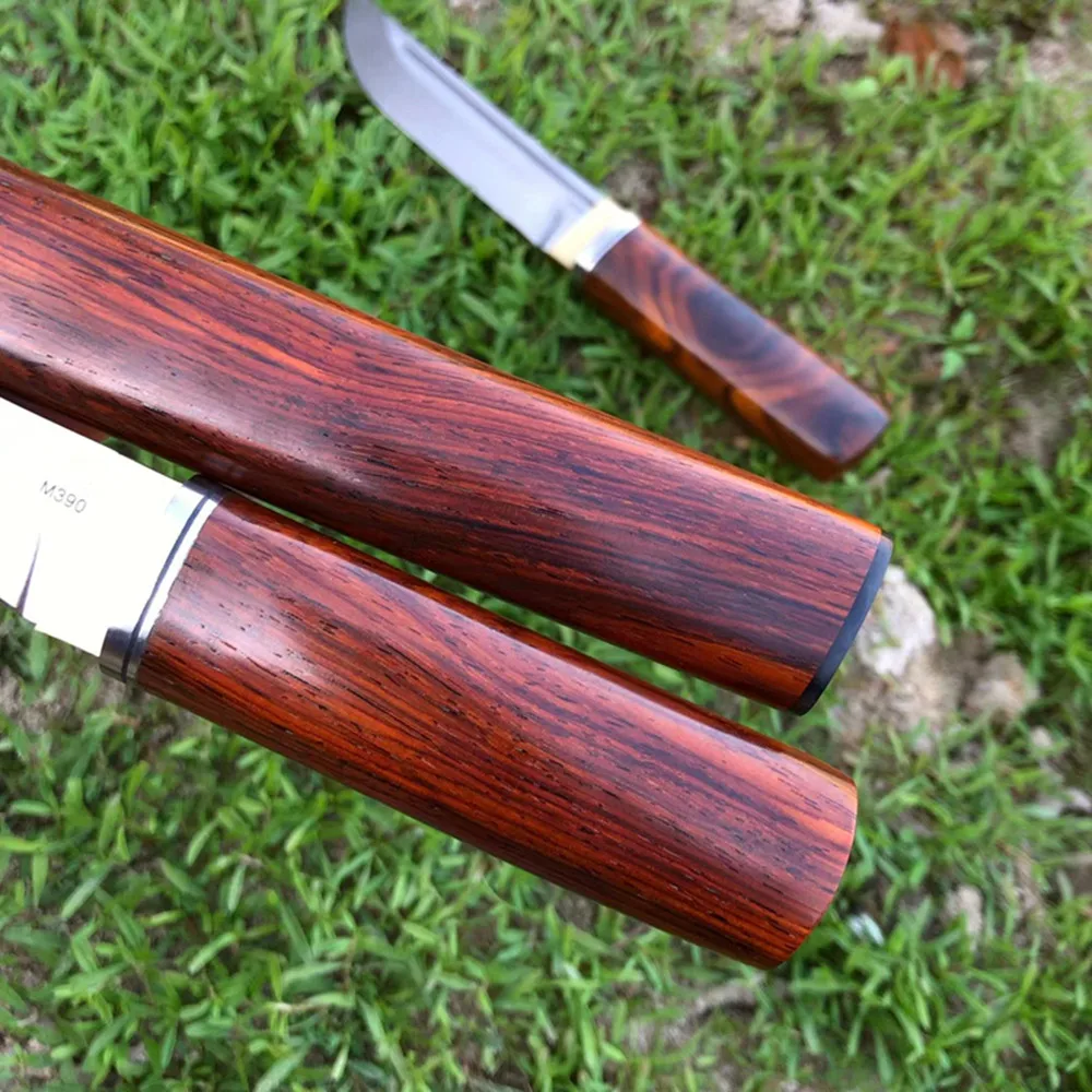 Length: 22.5 cm Blade length: 9.8 cm Handle: 10.5 cm Blade thickness: 3.8MM Blade width: 2.9 cm HRC hardness: 62HRC Steel: M390 steel Handle material: imported American sandwood