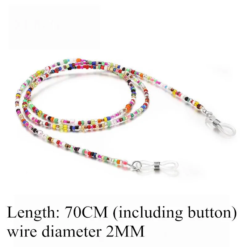 1. Тип товара: цепочка для очков 2. Цвет: разноцветный 3. Длина: 70 см 4. Повод: Годовщина, подарки, вечеринка 5. Материал: бусины из АБС-пластика и силиконовый интерфейс 6. Функция: очки предотвращают скольжение, украшение, совпадение 7. Потому что это разноцветный цвет бисера, каждая партия немного отличается