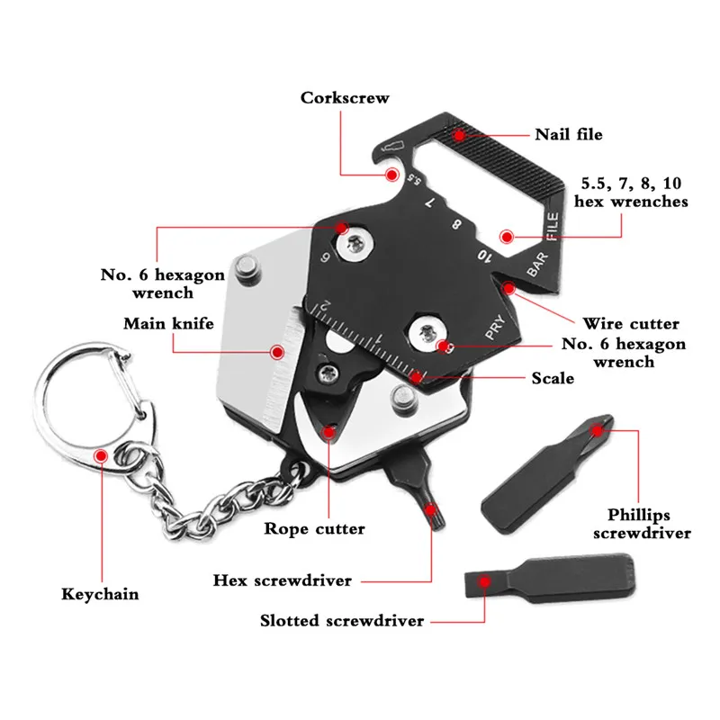 6.Function: Coin tool kit includes, key chain, bit connector (single screwdriver, Phillips screwdriver, Torx screwdriver), hexagon wrench 10/8/7/6 / 5.5, bottle opener, scale (cm), cutter / Nail puller, etc.