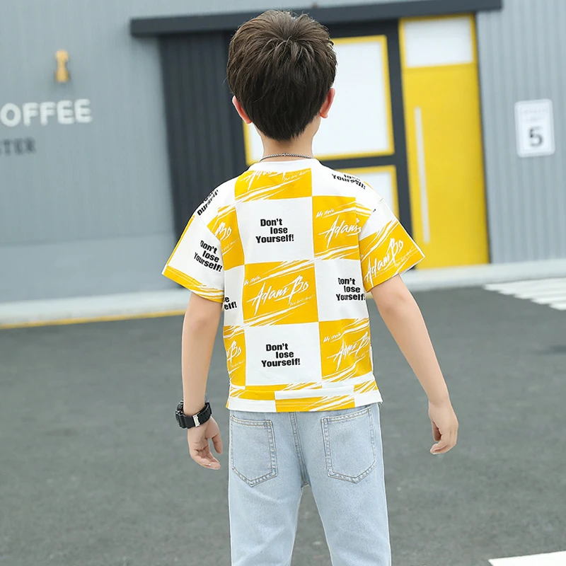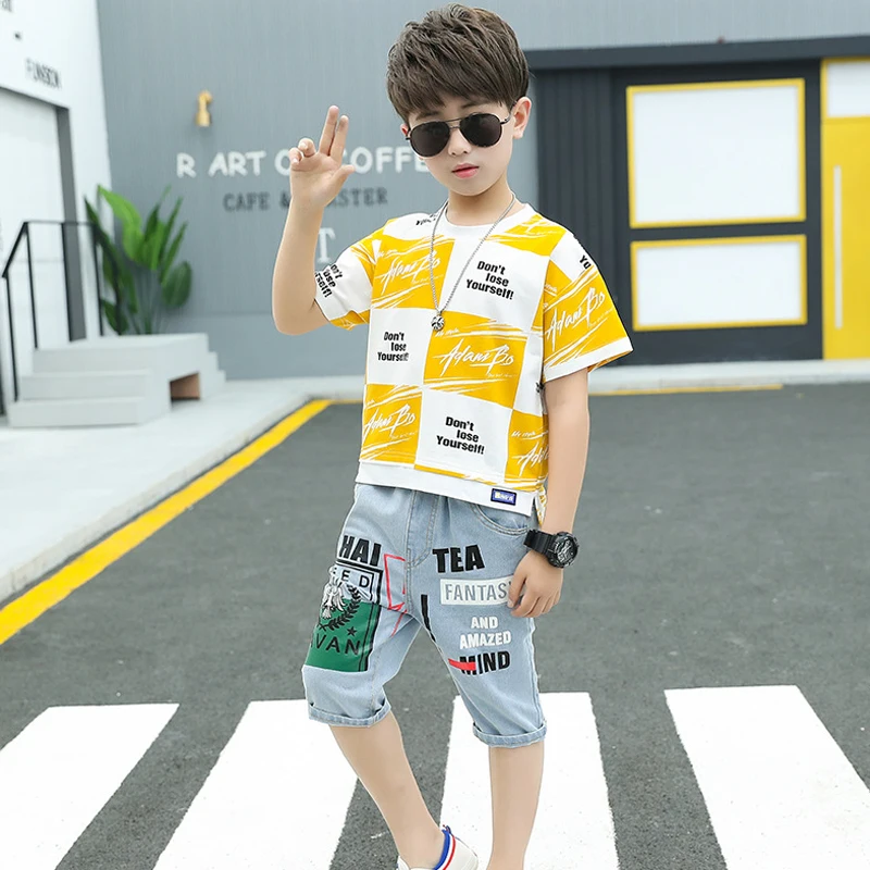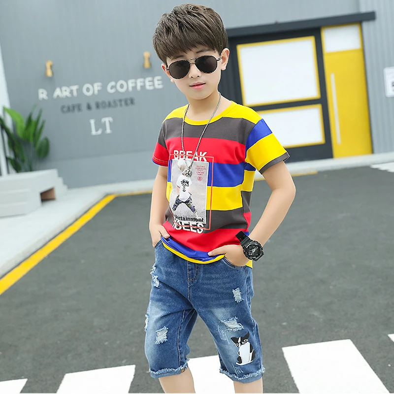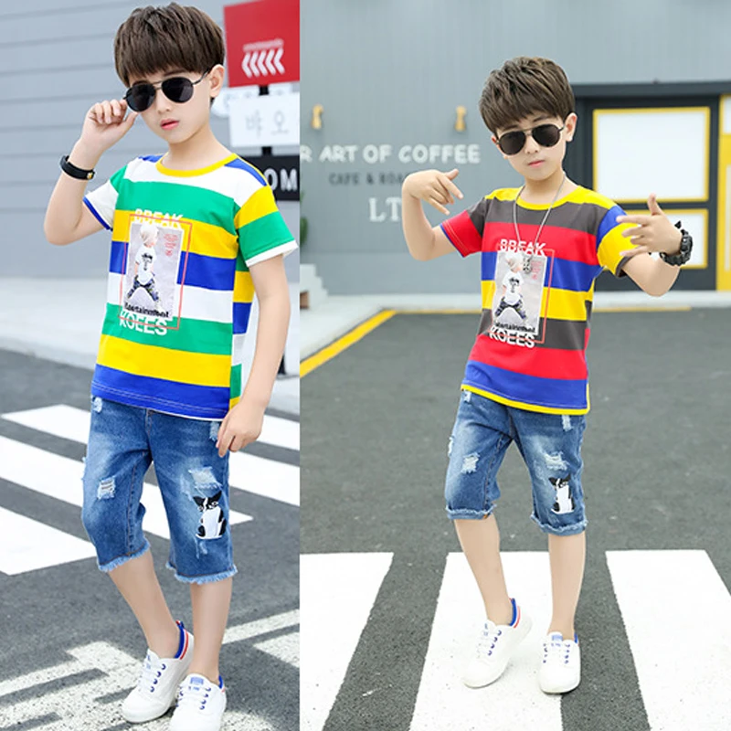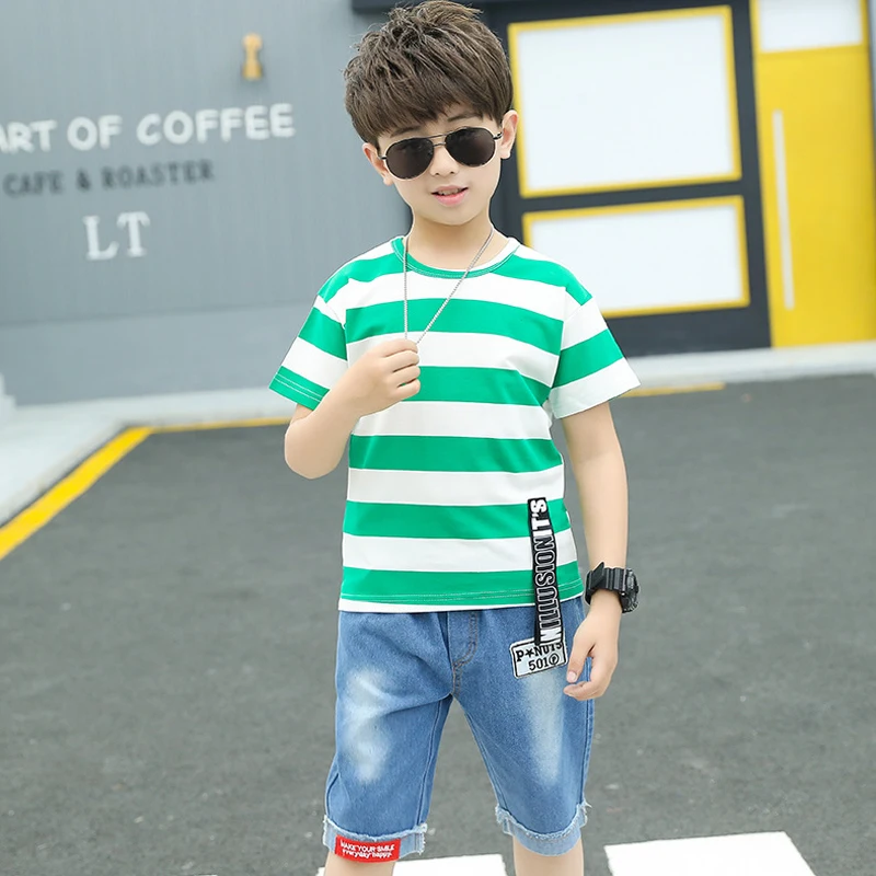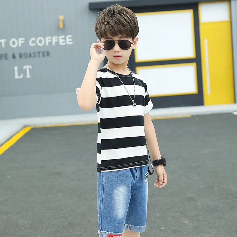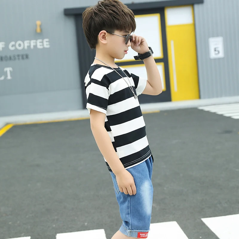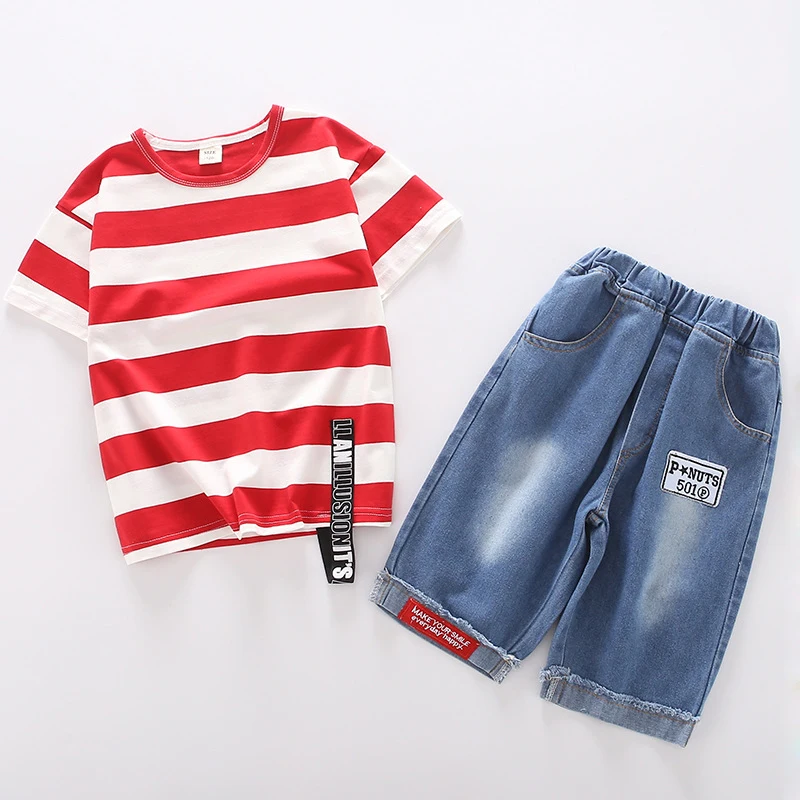 Одежда для маленьких мальчиков летний спортивный костюм модная Универсальная футболка в полоску + джинсы средней длины детская одежда высокого качества