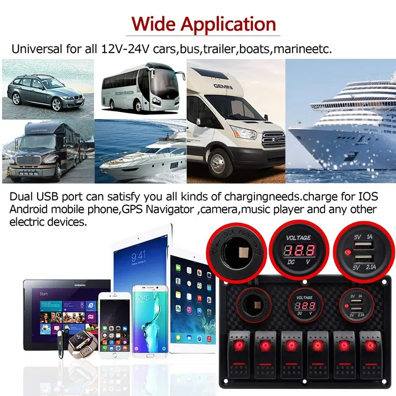 Полностью функциональный: Этот переключатель панель имеет цифровой дисплей напряжения, светодиодный светильник, водонепроницаемыми панелями с 12V зарядное устройство и двойной usb-адаптер источника питания мощностью 5 В.