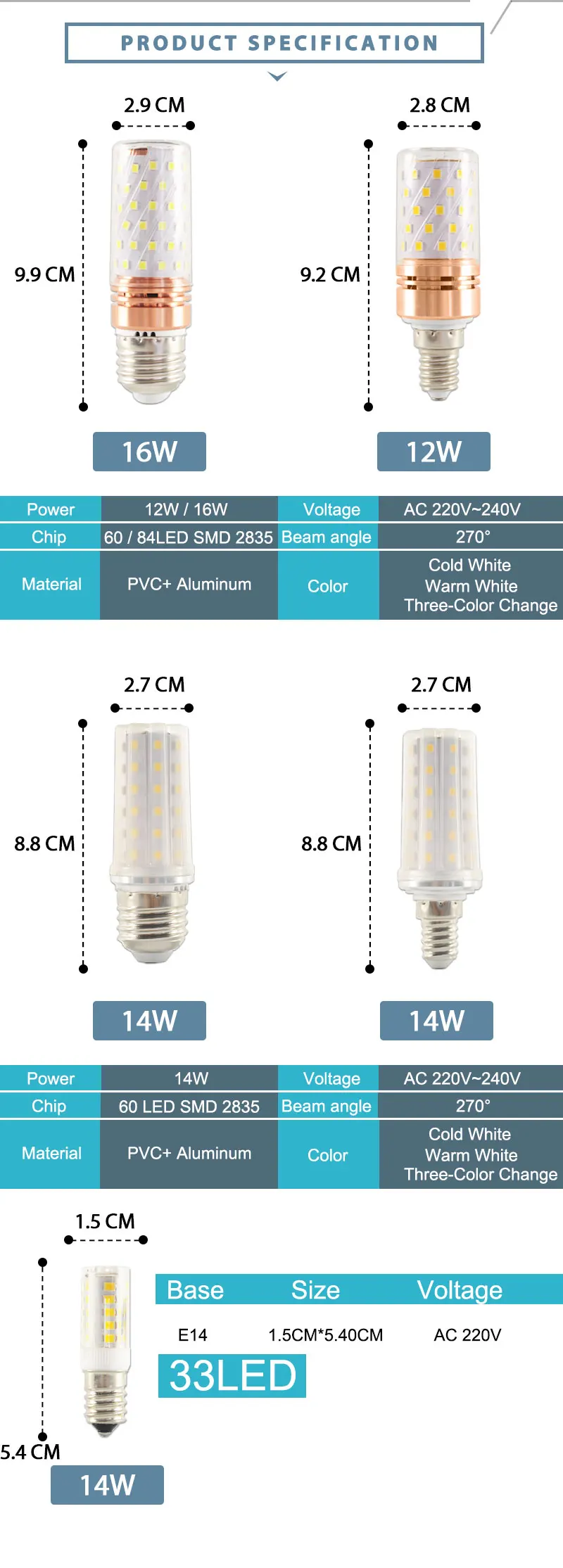 Низкое потребление, высокая яркость. Энергосбережение и экологичность, способствует переработке. Низкое тепловыделение, отсутствие УФ или ИК-светильник. Сейсмическая, ударопрочность, нетепловое излучение, безопасная и стабильная, надежная. Подходит для домашнего, офисного и выставочного освещения. Очень низкий нагрев, кроме экономии энергии на светильник. Он имеет длительный срок службы, никаких опасных материалов. Мгновенный запуск, не мигает. Прочный, ударопрочный. Экономьте мощность больше, чем обычные лампы. Изготовлен из высококачественных материалов. Спецификация: Тип цоколя: E27/ E14 Напряжение: AC200V-240V Тип СВЕТОДИОДА: SMD 5730 Количество СВЕТОДИОДНЫЙ: 24 светодиодный s/ 36 светодиодный s/ 48 Светодиодный s/ 56 светодиодный s/ 69 светодиодный s/ 72 светодиодный s Цвет светильника: теплый белый/белый Цветовая температура: 6000-6500K (белый); 2800-3500K (теплый белый)