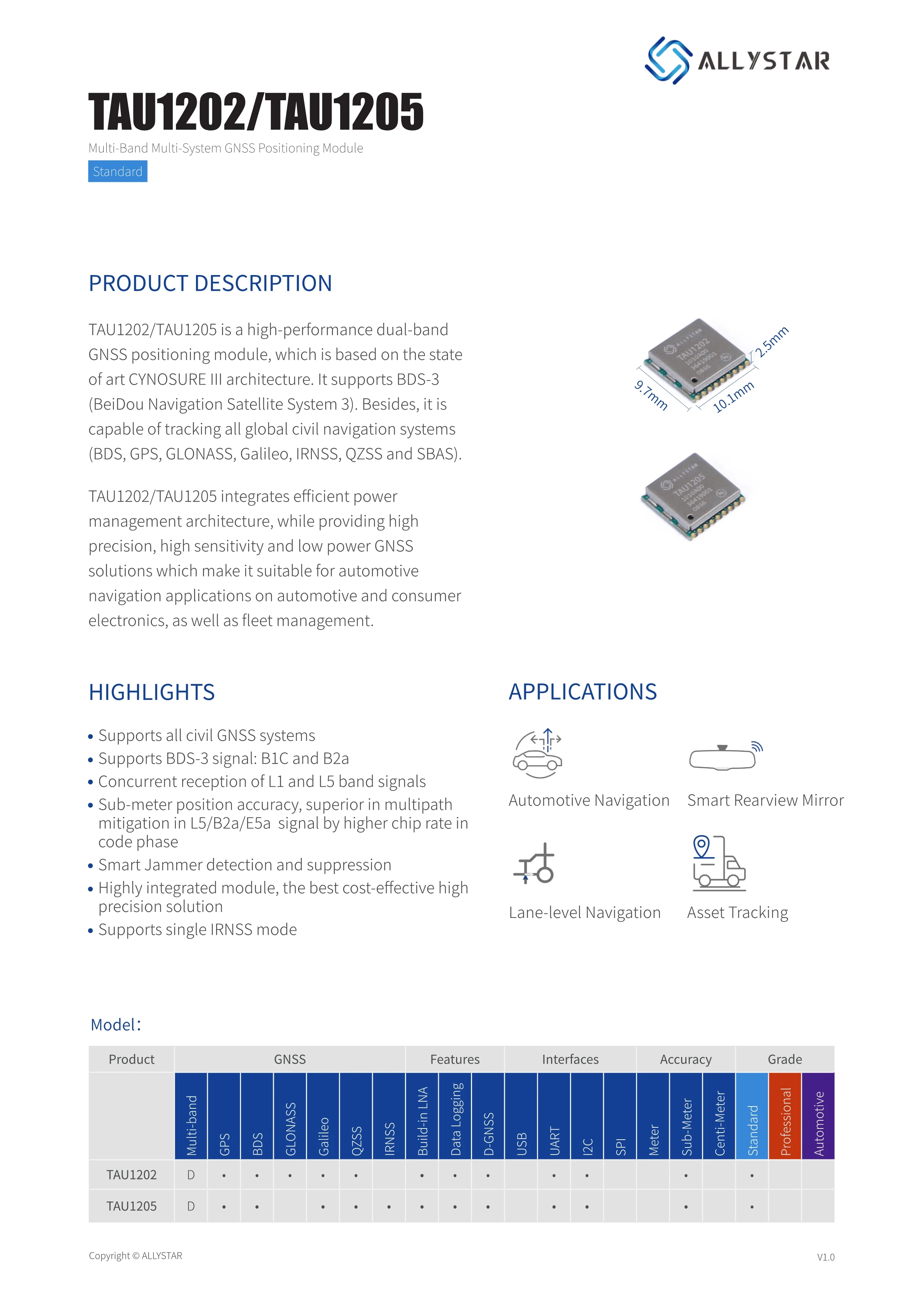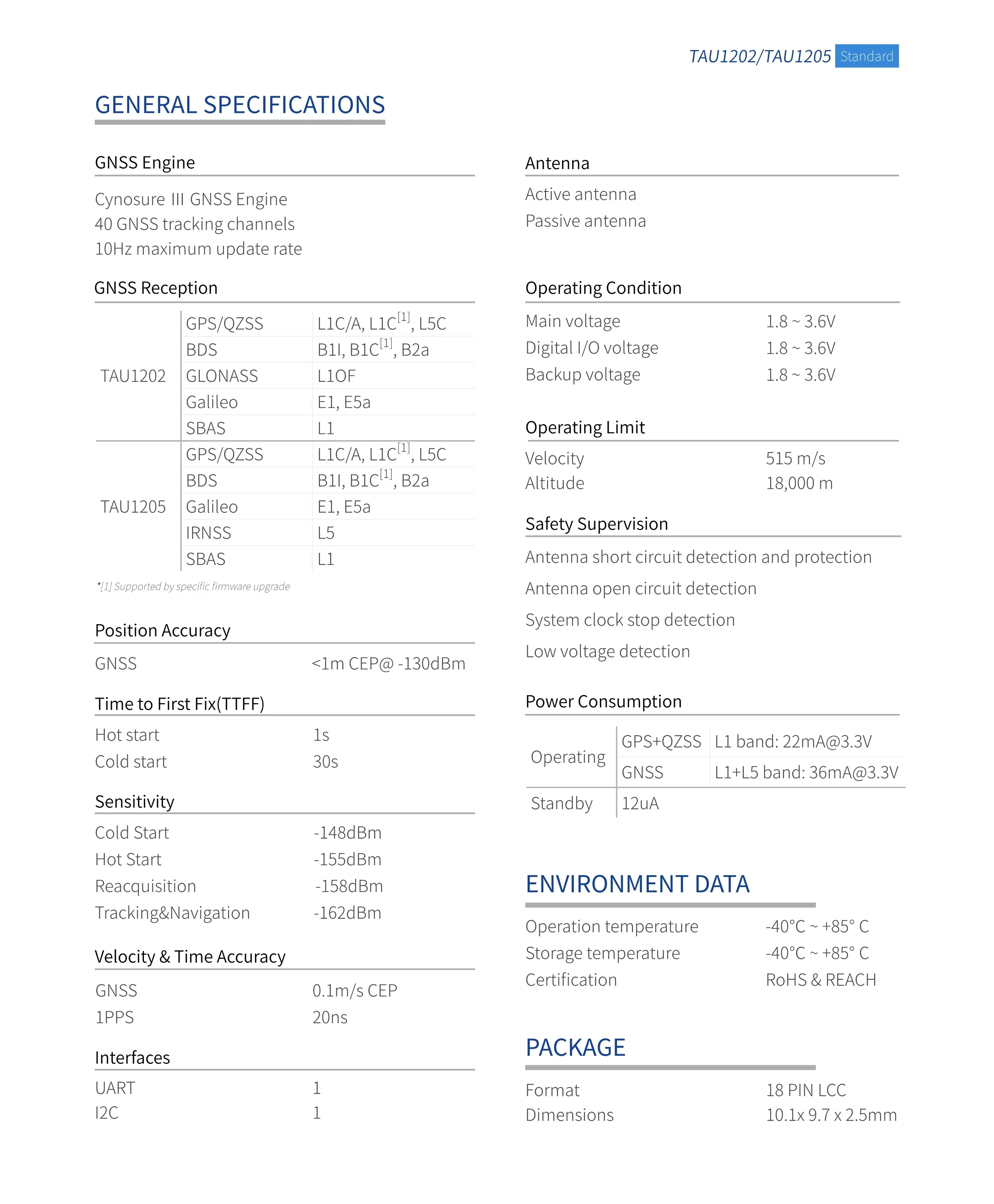 TAU1202-это высокопроизводительный двухдиапазонный модуль позиционирования GNSS, который основан на современной архитектуре CYNOSURE III. Поддерживает BDS-3 (BeiDou навигационная спутниковая система 3). Кроме того, он способен отслеживать все глобальные системы навигации (BDS, GPS, GLONASS, Galileo, QZSS и SBAS). TAU1202 интегрирует эффективную архитектуру управления питанием, обеспечивая при этом высокую точность, высокую чувствительность и низкую мощность GNSS решений, которые делают его пригодным для навигационных приложений на автомобильной и бытовой электронике, а также управления флотом. Особенности продукта Поддерживает все системы civil GNSS Поддерживает сигнал BDS-3: B1C и B2a Одновременный прием сигналов диапазона L1 и L5 Точность положения суб-метра, превосходное в мультипутном уменьшении и более низком уровне шума в долине города Интеллектуальное обнаружение и подавление помех Высоко интегрированный модуль, Лучшее Экономичное высокоточное решение Упаковочный лист 1 X модуль позиционирования