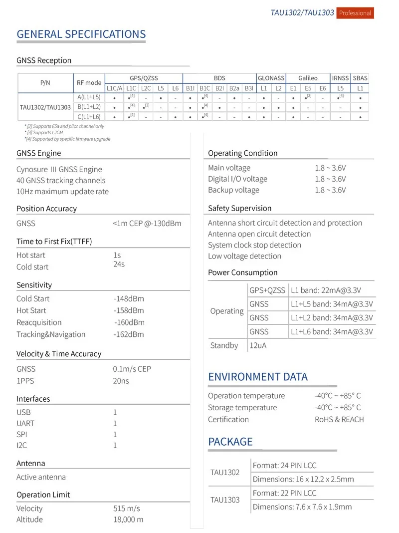TAU1302-это высокопроизводительный двухдиапазонный модуль позиционирования GNSS, который основан на современной архитектуре CYNOSURE III. Поддерживает BDS-3 (BeiDou навигационная спутниковая система 3). Кроме того, он способен отслеживать все глобальные системы навигации (BDS, GPS, GLONASS, Galileo, QZSS, IRNSS и SBAS). TAU1302 интегрирует эффективную архитектуру управления питанием, обеспечивая высокую точность, высокую чувствительность и низкую мощность решений GNSS, которые делают его подходящим для высокоточных отраслей промышленности, таких как высокоточное сельское хозяйство, геодезирование и картографирование, мониторинг деформации, БПЛА (беспилотный летательный аппарат), И т. д. Характеристики продукта компактный размер для высокой точности промышленности одновременного приема многодиапазонных сигналов GNSS с помощью трех RF настроек: Вариант A: L1 и L5 Вариант B: L1 и L2 вариант C: L1 и L6 современное низкое энергопотребление поддерживает многодиапазонный многосистемный Высокоточный выход необработанных данных, легкий для 3-й вечерние интеграции высоко интегрированный модуль, лучшая экономичная Высокая точность GNSS раствор упаковочный лист 1 X позиционирование Модуль