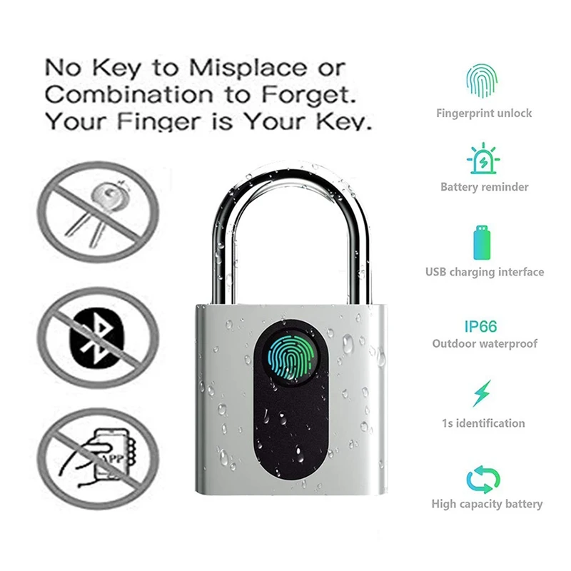 [Высокая безопасность и прочный и портативный] замок изготовлен из цинкового сплава для отличной коррозионной стойкости и легкого веса, чтобы обеспечить Компактный и стильный Умный Замок для вас. Этот замок для отпечатков пальцев может использоваться в дождливые дни, водонепроницаемый замок до уровня IP66 может эффективно предотвращать попадание пыли и дождя.