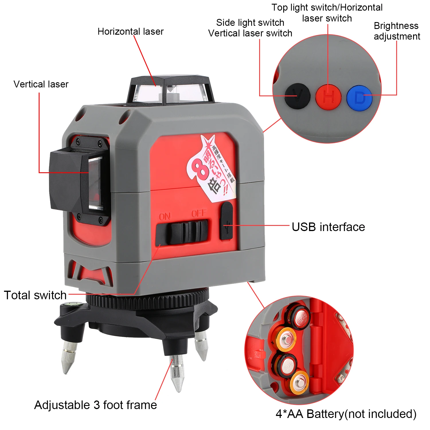 1. Класс водонепроницаемости: IP: 54 2. Точность: ± 2,2 мм/10m 3. Точность ортодропного: 90 ° ± 30 4. Диапазон выравнивания: ± 3 ° 5. Выравнивание: гравитационный маятник 6. Рабочий диапазон (радиус): 20 м 7. Источник питания: 4 × 1,5 V AA батарея (не в том числе) 8. Время работы аккумулятора: 4,5 часов 9. Источник питания 2: внешний источник питания USB для мобильного телефона (включая шнур питания) 10. Источник питания 3: Внешний USB 5 В мобильный источник питания (за исключением) 11. Лазерный диод: 635nm 12. Мощность лазера: 100 мВт