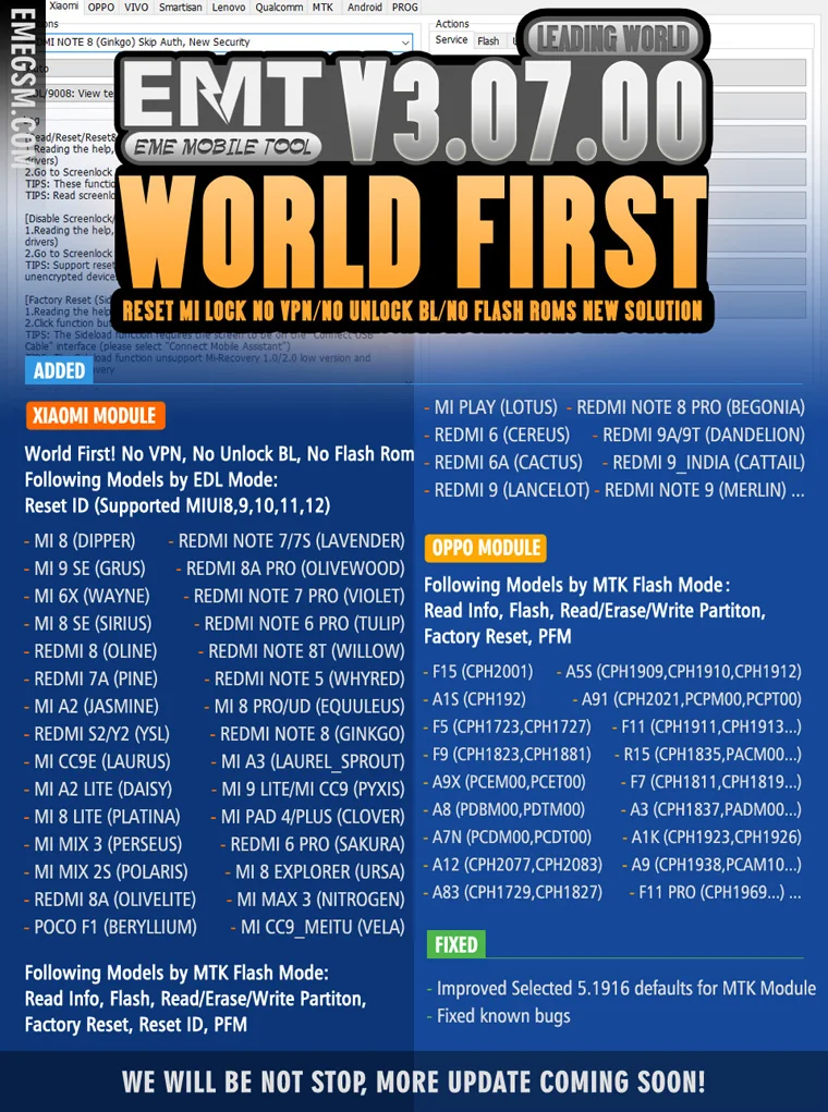 Добавлено решение MTK Skip Auth, поддержка Flash / Unlock и т. Д. Для моделей Xiaomi / OPPO MT6762, MT6763, MT6765, MT6768, MT6771, MT6785, MT6873 и т. Д.