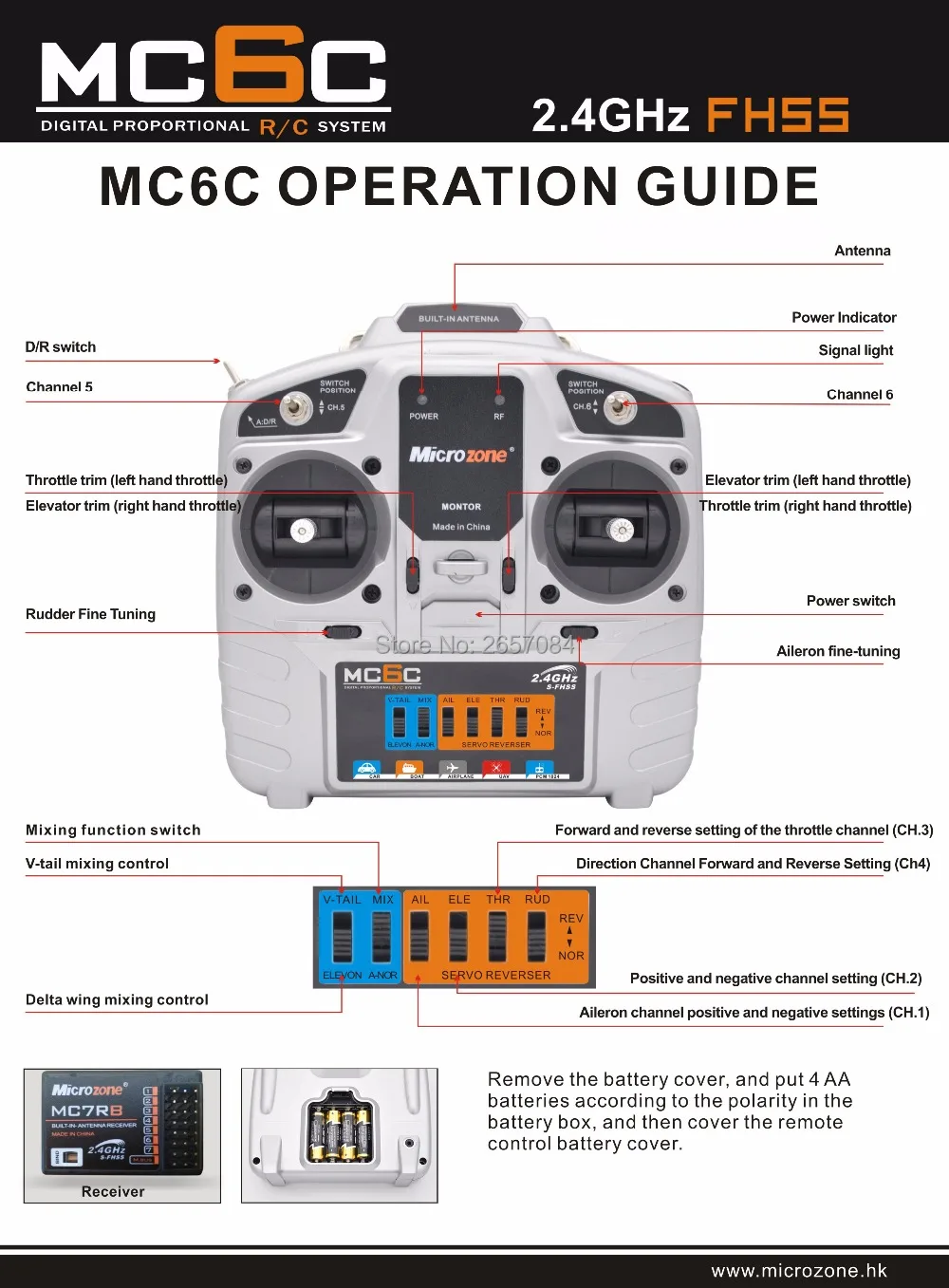 1 шт. x контроллер MicroZone MC6C 2,4G 6CH, передатчик с приемником