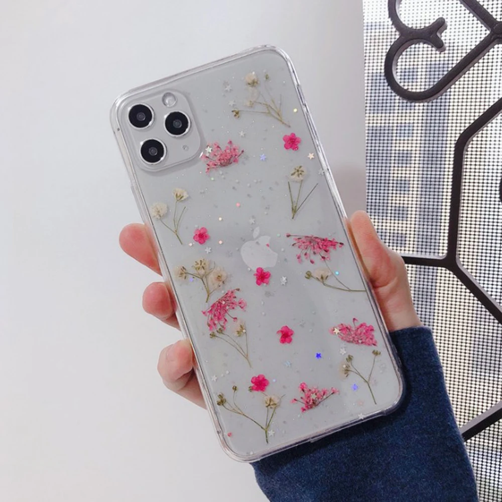 Прозрачный блестящий розовый Силиконовый чехол для телефона Gypsophila для iPhone 11 Pro 7 8 6 6S Plus X XR XS Max, настоящая задняя крышка с высушенным цветком