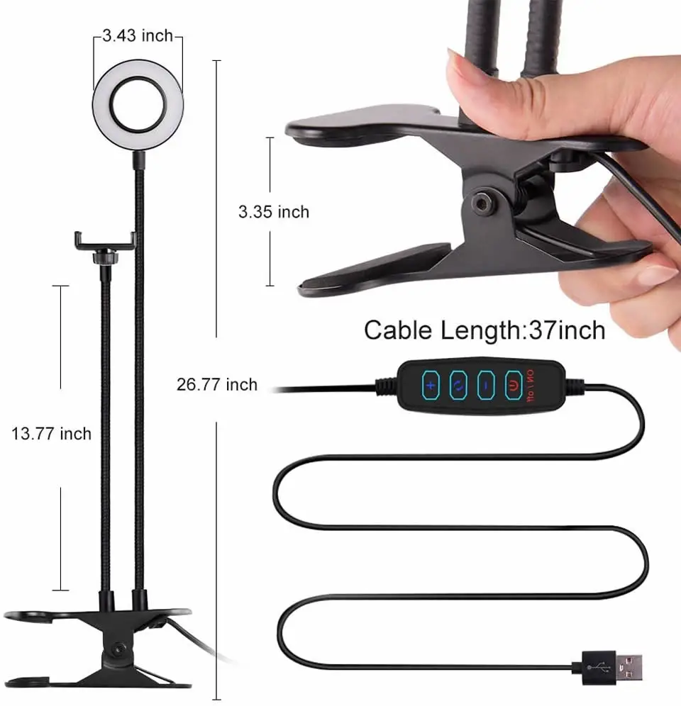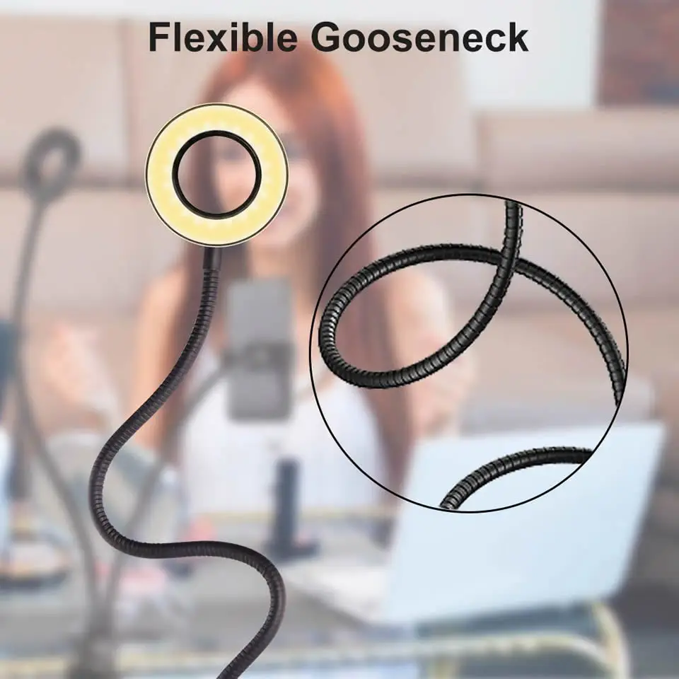 Особенности: 2 в 1 держатель сотового телефона с светодиодный светильник, Держатель сотового телефона: ● Вращающийся на 360 градусов держатель телефона, можно свободно регулировать любой угол, который вам нравится, для удобного просмотра, фотографирования или съемки видео. ● Изготовлен из металла, имеет мощную силу укуса. Ширину фиксированного сечения можно отрегулировать от 0 до 2,75 дюйма (7 см). Он совместим с большинством столов и столов различной толщины. ●Width является 2,28 дюймов минимум до 3,15 дюйма Максимальная будет совместим с большинством смартфонов, для iPhone 7 plus, 7 plus, 6, 6s, 5, 5s, 4, 4s/iPod touch/Samsung/LG/Huawei/HTC и т. Д. Светодиодный светильник для селфи: ● Светодиодный светильник дизайн с 10 регулируемой яркостью для вашего выбора, удовлетворить все ваши потребности в различных условиях. 3 цвета: белый, теплый желтый, теплый желтый + белый. Он пригодится, когда вам понадобится дополнительный светильник для создания, фотографирования, создания видео, чтения книг и потокового воспроизведения! ● Поддерживает usb-порт, работает с несколькими устройствами. Вы сможете наслаждаться как лампой, так и держателем мобильного телефона в любое время! ● Кнопка переключения для регулировки лучшей яркости и цвета для ваших нужд. ● Экологический светодиод, безопасен и защищает ваши глаза. Технические характеристики: Материал зажима: углеродистая сталь Общая Длина кронштейна: 580 мм Светодиодный светильник, высота: 650 мм (шланг 9*550 мм) Высота стента: 350 мм (шланг 9*350 мм) Размер лампы: Наружный диаметр 100 мм Длина шнура: 1,3 м Цвет: черный Количество СВЕТОДИОДНЫЙ: 24 шт. Светодиодный источник питания: 12 Вт Светильник источник света: холодный белый, теплый белый свет, холодный и теплый светильник Источник питания: USB 5 В Посылка включает в себя: 1 х кольцевой светильник для селфи с держателем для мобильного телефона