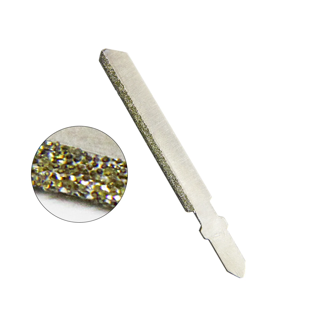 Общая длина: 76 мм (3 дюйма) Рабочая длина: 51 мм (2 дюйма) Лезвие для нашивки ширина: 8,5 мм Толщина лезвия: 0,8 мм Зернистость 50 (грубая зернистость) Т хвостовик подходит для многих брендов лобзиков
