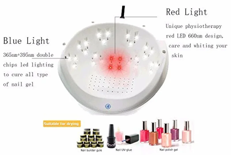 Форма рта рыбы с большим пространством и открытым дизайном Подходит для всех размеров и длины ногтей Высокая мощность 50 Вт, 24 шт. двойной светильник 365nm + 405nm led Подходит для всех видов УФ-геля и светодиодный гель 4 шт. красный светильник 660nm led для ухода за кожей 3 ЖК-таймера: 30s, 60s, 90s (модель низкого нагрева) Умный автоматический датчик Сохраняйте функцию ONrdquo Нижний лоток для удаления ног Просторный, удобный интерьер для всех размеров и длины ногтей